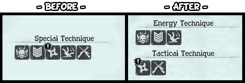 Данный мод позволяет выбрять одну специальзацию на оружии ближнего боя и специализацию на оружии дальнего боя и аналогичным образом добавляет разделение техник.