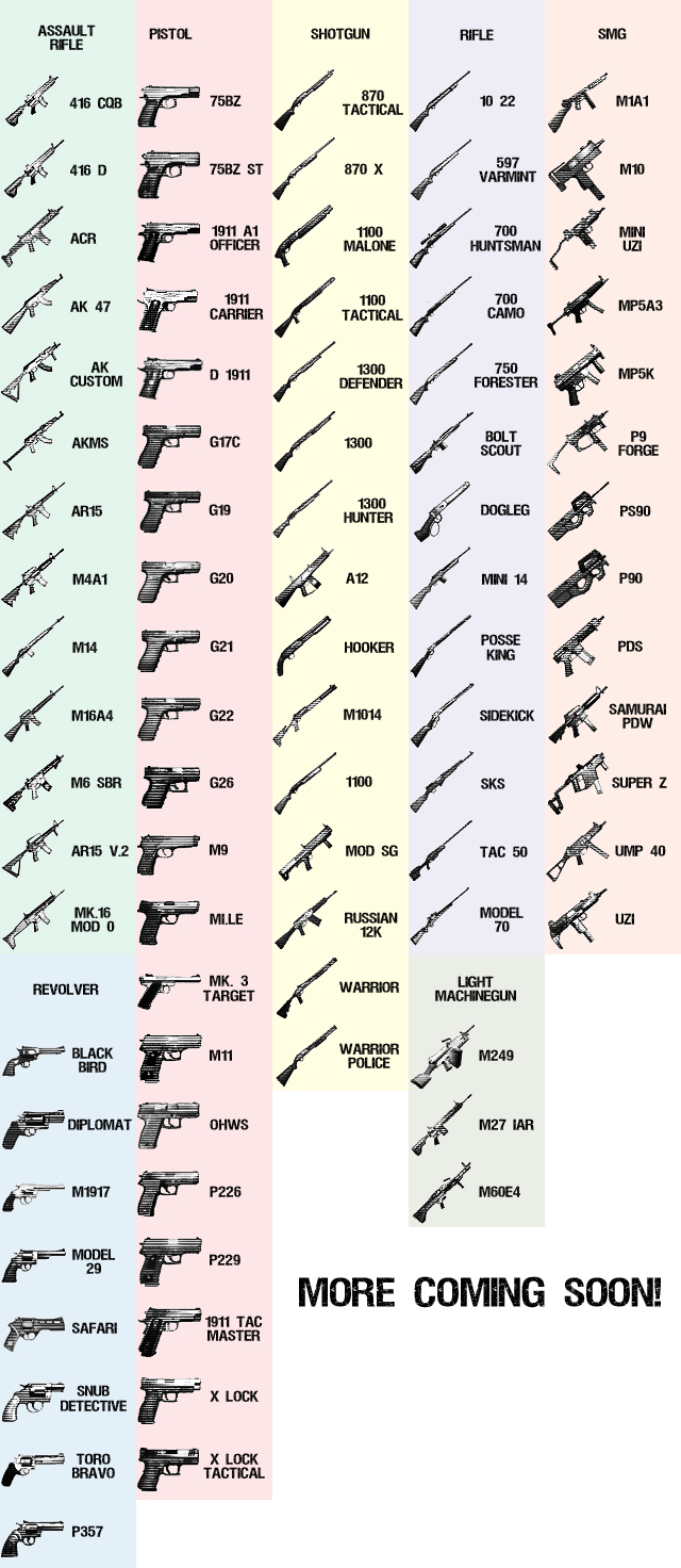 С их помощью вы можете крошить орды врагов. Пули для такого вооружения довольно редкие и дорогие. Могут быть оснащены глушителем и улучшены на базе.