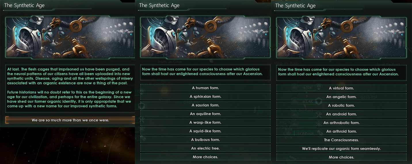 Данный мод является расширенной версией Animated Synthetic Portraits. Silfae решил увеличить разнообразие роботов для негуманоидальных видов. Роботы\Андроиды\Синтетики имеют различный внешний вид в зависимости от типа расы. Мод дает возможность выбрать внешность будущего вида при синтетическом вознесении, а также возможность стартовать игру за такую расу. Вознёсшиеся синтетики ИИ никогда не смогут появится на карте при старте.