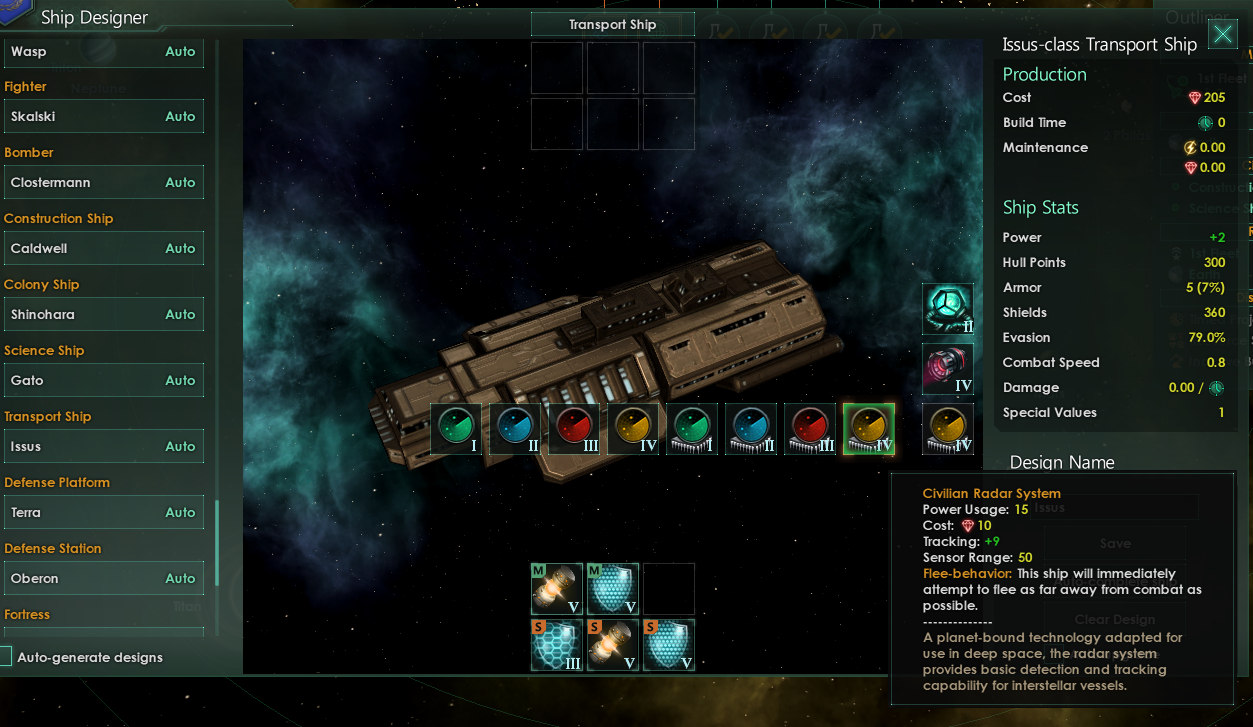 Добавляет 4 новые типы датчиков, которые могут быть оборудованы на гражданские суда, добавляет поведение "бежать" кораблю.