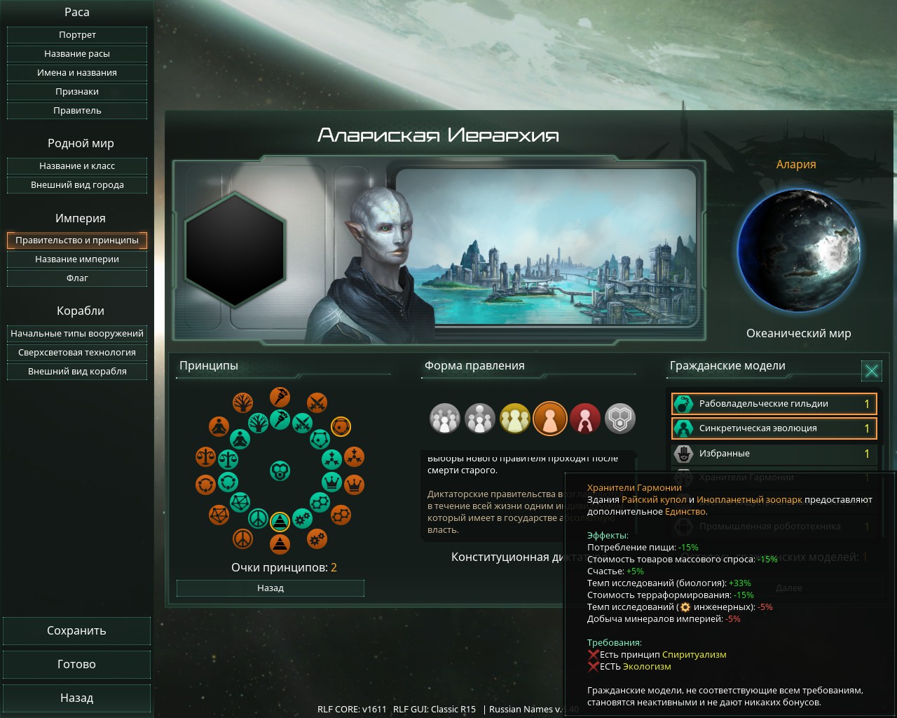 Модификация изменяет ВСЕ базовые принципы и гражданские модели, попутно добавляя новые, а также одну форму правления(ещё одну демократию).