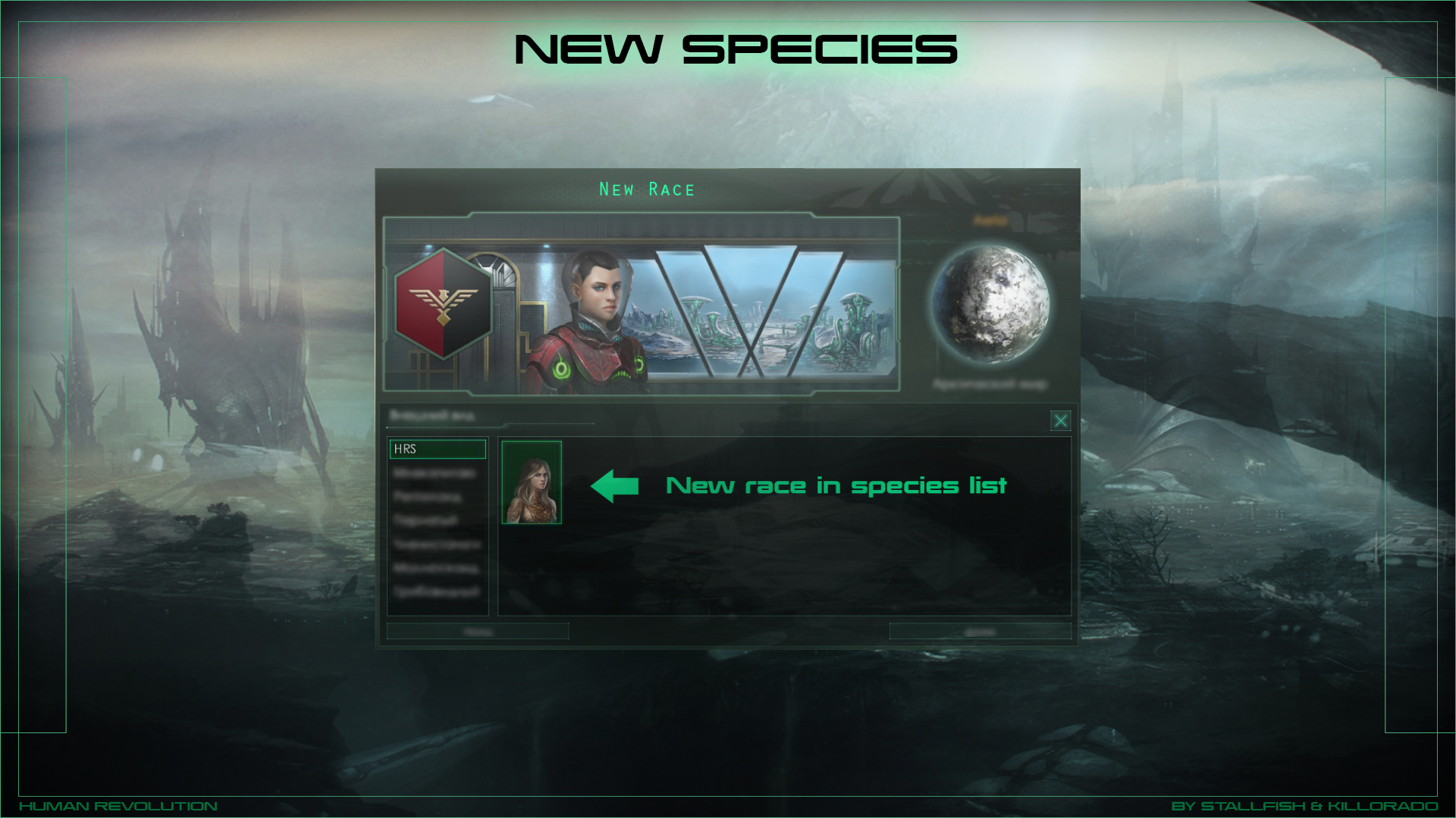Этот мод добавляет новую расу в игру "HRS" (Standalone), или просто добавляет новые лица\одежду для людей. Он никак не отражается на геймплее или балансе игры. Новая раса идентична стандартной расе людей. Все текстуры переделаны вручную, что-то дорисовано\подправлено. Данный мод был создан чтобы визуально показать технологический прогресс расы людей, как им пришлось измениться внешне ради космических путешествий. Так же хотелось больше выделить человечество по сравнению с другими расами, изначально они выглядят упрощенно. Мы решили сделать данную расу отдельной, потому что в игре отсутствует возможность перелистывания списка доступных видов расы.