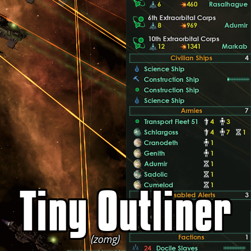 Tiny Outliner - Данный мод уменьшает список гражданских кораблей(строительные, научные), а также наблюдательных постов в списке. Не затронуты иконки планет и боевого флота.