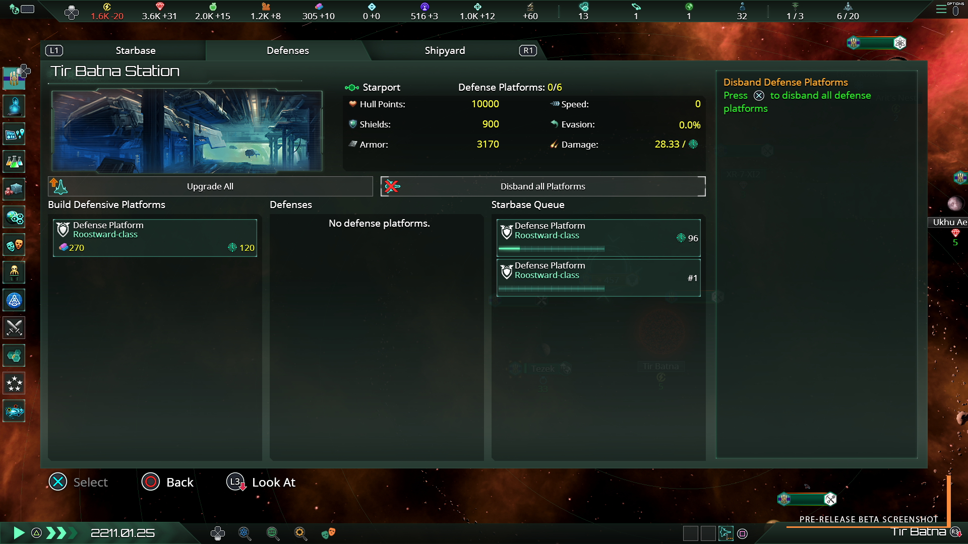 Кроме того, на космических базах можно строить оборонительные платформы, которые помогут им в защите. Платформы образуют "флотилию" вокруг базы, обеспечивая ей огневую поддержку и предоставляя дополнительную мощь, чтобы база могла противостоять целым флотилиям. Максимальное количество платформ у базы зависит от различных факторов, таких как модули и сооружения, технологии, политики и т.д. Задумка в том, что если вы вкладываетесь в них, то мощь космических баз будет расти на протяжении всей игры, и не начнёт безнадёжно отставать к её концу, как это происходит с военными станциями и космопортами в текущей версии игры.