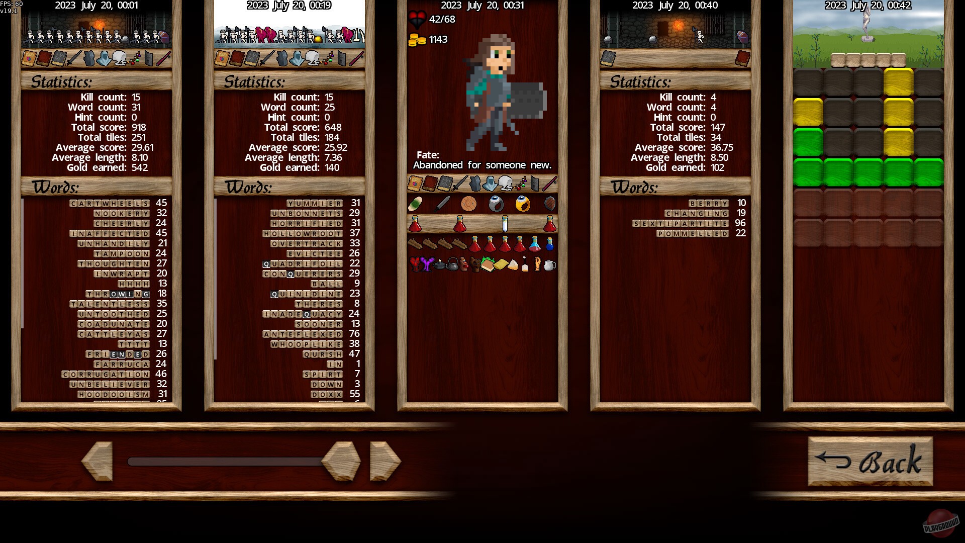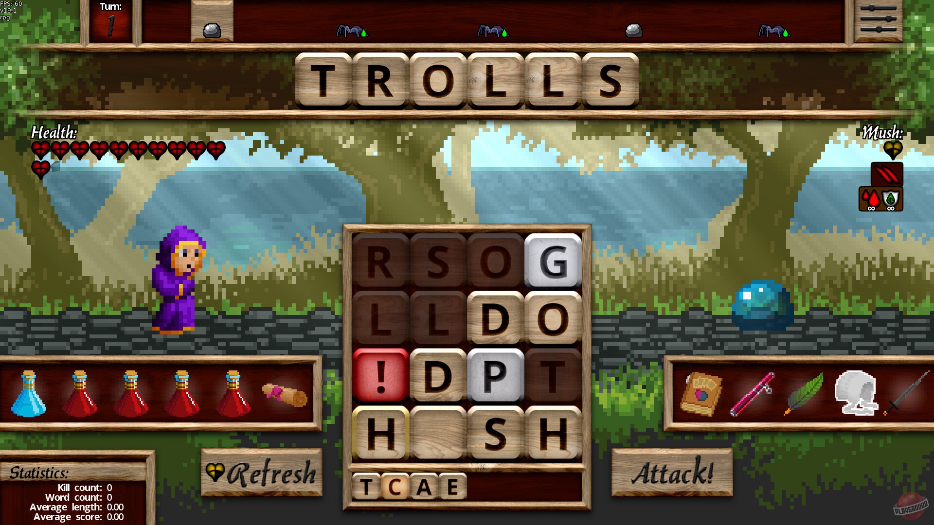 Ролевая игра, в которой вместо мечей и заклинаний вы сражаетесь словами. Ходите по карте, встречаете разных монстров, а чтобы их победить — составляете слова из набора букв. То есть перед вами лежит сетка с буквами, а противник стоит и ждёт. Вы составляете из этих букв слово — скажем, «кошка» — и таким образом наносите урон врагу. И чем длиннее слово, тем больнее бьёте. Есть ещё особые буквы, которые дают дополнительные очки, как в Скрэббле.