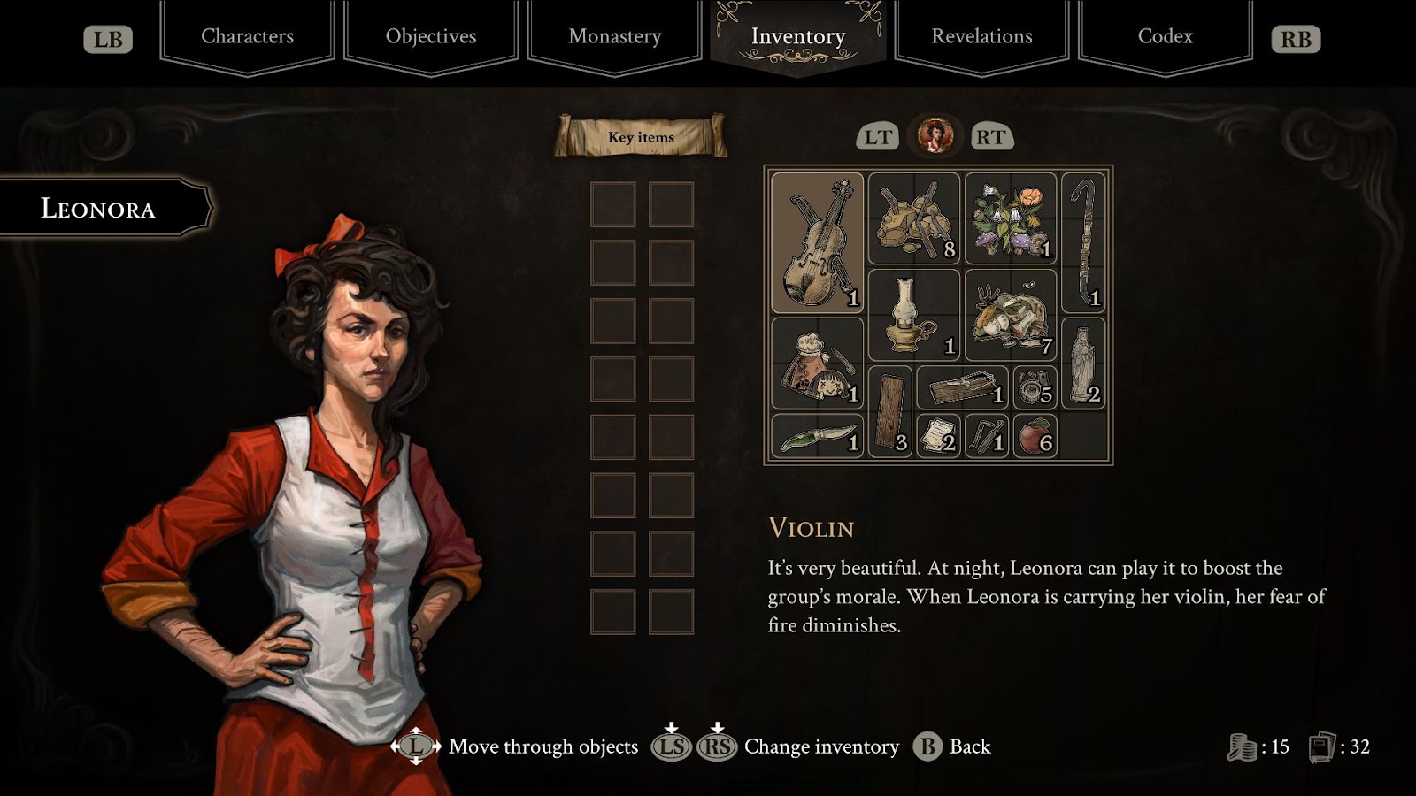 Леонора, в отличие от Альфредо, храбра и жестока — она умеет оглушать постояльцев монастыря, взламывать замки, забираться по стенам наверх, но совершенно не переносит больших очагов пламени. Либо переключаем механизмы для отключения огня, либо гасим его вручную, иначе девушка получит ментальную травму. Убить врага девушка тоже может, но сразу же теряет рассудок и режет себе руки из-за чувства вины.