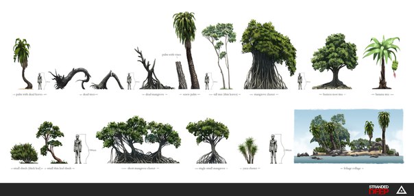 Помимо всего этого, идет переработка деревьев и листвы. Разработчики опубликовали пример в виде концепта потенциальной растительности в Stranded Deep. Затем все из концепта моделлируется в SpeedTree: