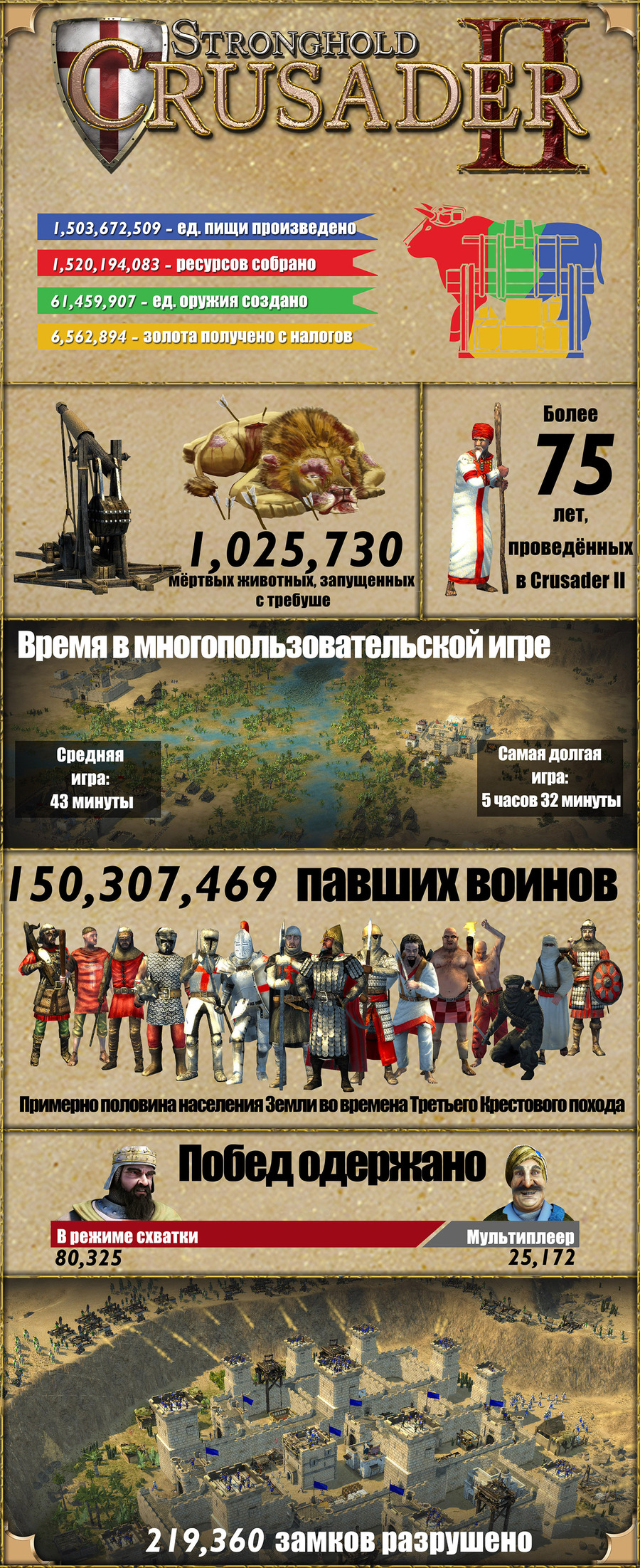 Студия Firefly Studios опубликовала в виде изображения инфографику по первой неделе активности игроков в Stronghold Crusader 2. Из нее можно узнать любопытную статистику, например, сколько успели разрушить замков или количество едениц произведенной пищи.