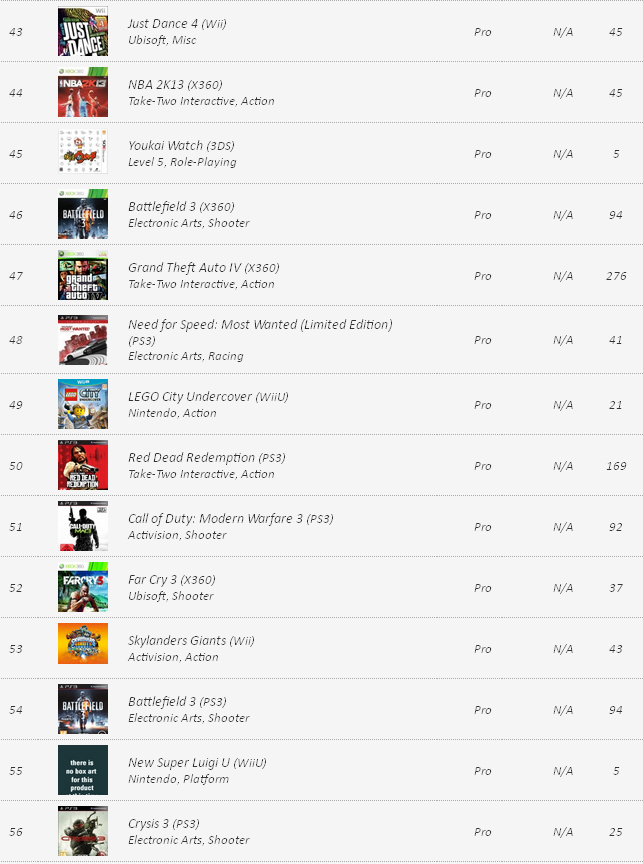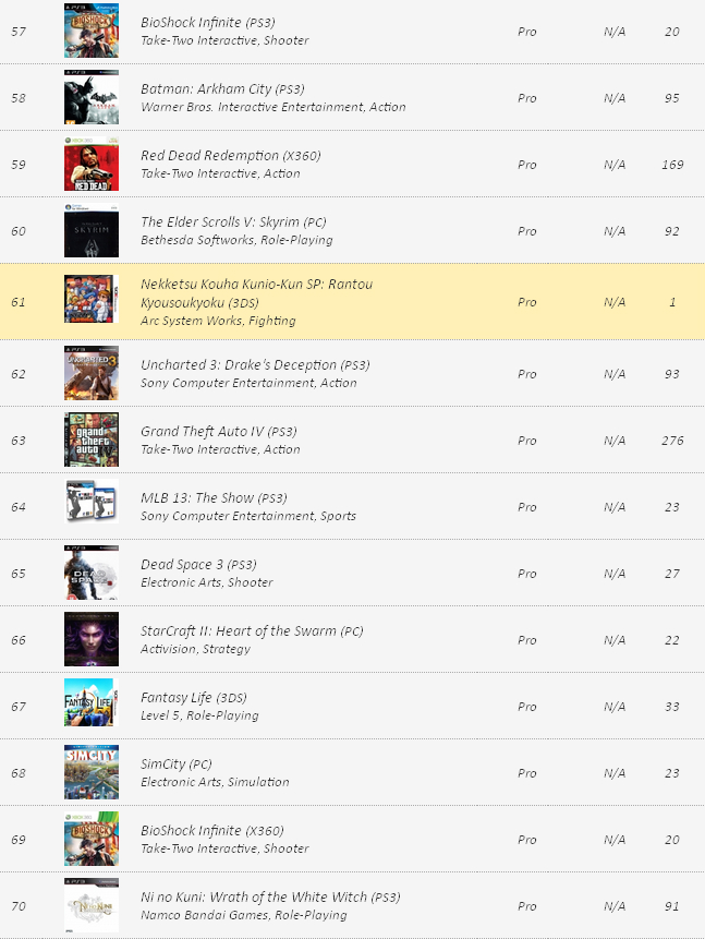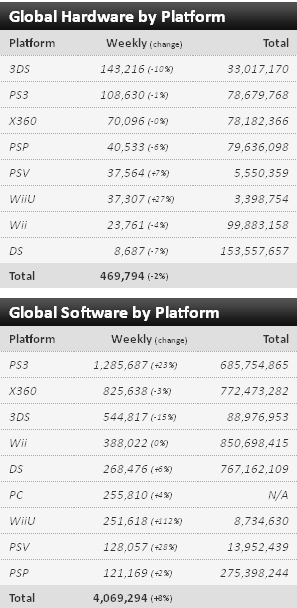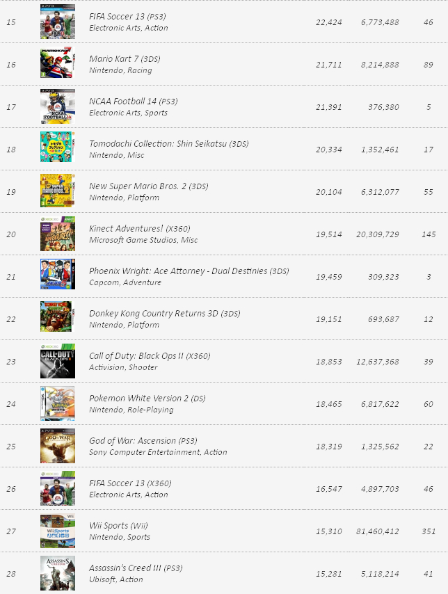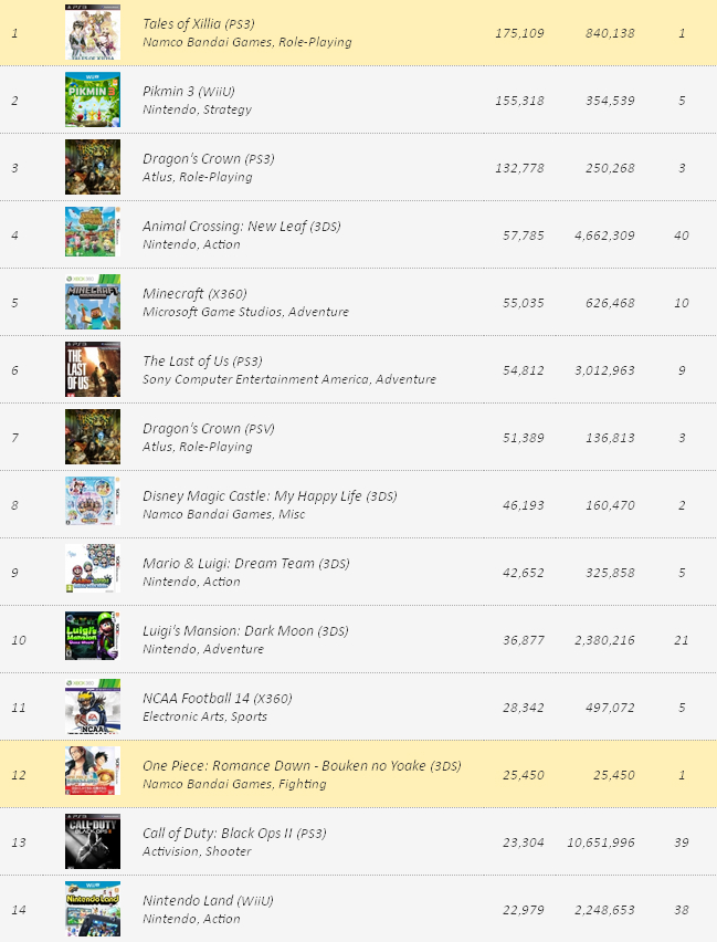 Ролевая игра Tales of Xillia от Namco Bandai для консоли PS3, вышедшая в Японии еще в 2011 году, наконец добралась до США и Европы и возглавила общий недельный чарт с 175,000 проданных копий. (Обратите внимание, что в базе сайта произошел сбой, в результате чего количество недель с момента оригинального появления "Ксилии" обнулилось до одной и игра повторно получила свойственную впервые появляющимся в мировом топе проектам желтую плашку).