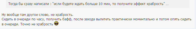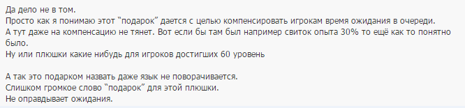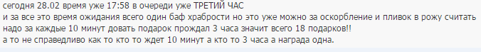 От полыхания и бомбежки на форумах не спасает даже заманчивая надпись «Если вам приходится ждать более 10 минут, вы можете получить подарок». Как оказалось «подарок», не что иное, как бесполезный баф, не особенно компенсировал многочасовое ожидание.