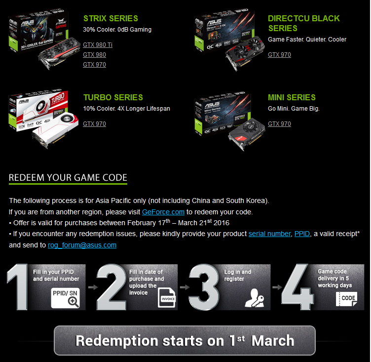 Тоже являюсь обладателем карты GTX 970 Turbo, покупал 7 января этого года, получил Лару сразу после заполнения формы. Хочу сказать, что форма на Дивизию отличается судя по всему, не знаю как будет, посмотрим. С Asus проблем не было на их сайте. Но с Дивизией может не прокатит.