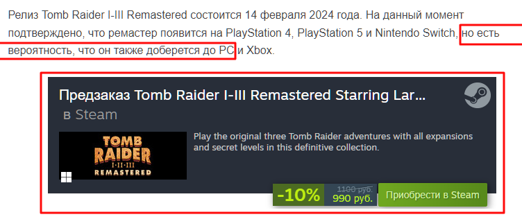 Релиз Tomb Raider I-III Remastered состоится 14 февраля 2024 года. На данный момент подтверждено, что ремастер появится на PlayStation 4, PlayStation 5 и Nintendo Switch, но есть вероятность, что он также доберется до PC и Xbox.