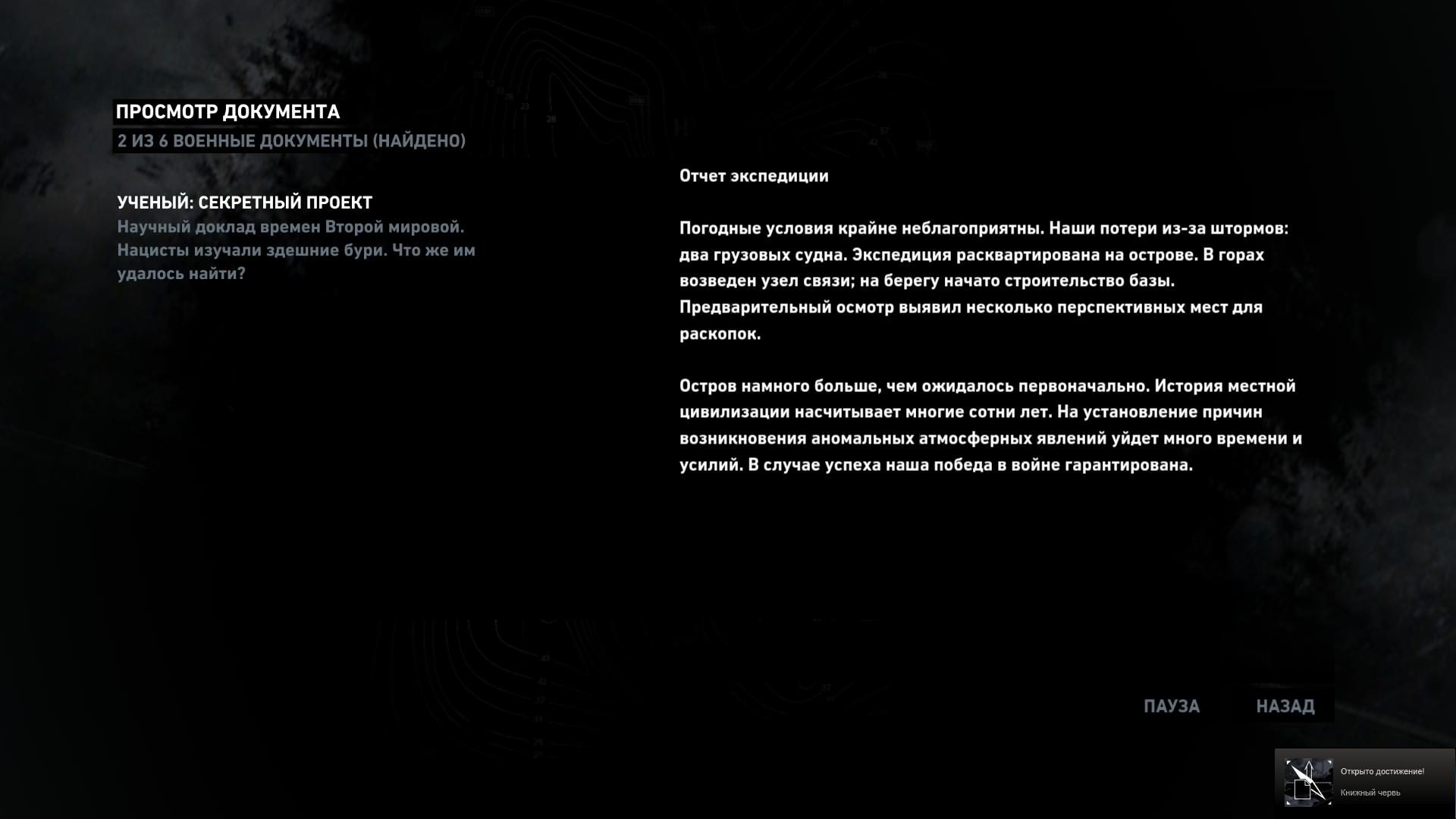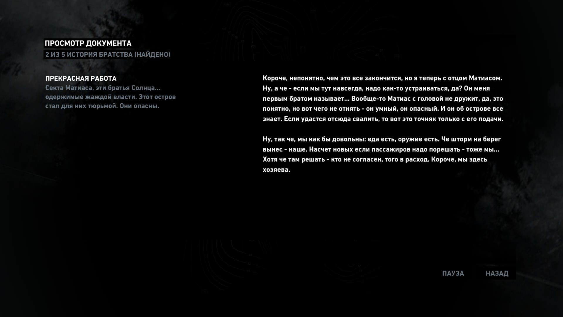 Сюжет тоже понравился и очень сильно напомнил сериал LOST,очень много схожего,классно что разрабы сделали столько секретов,тайников,дневников из которых узнаёшь очень многое и о сюжете,и о персонажах,то какие у каждого планы и мысли,как Матиас создал свою секту,как его правая рука хочет занять его место,читать всё это довольно интересно.