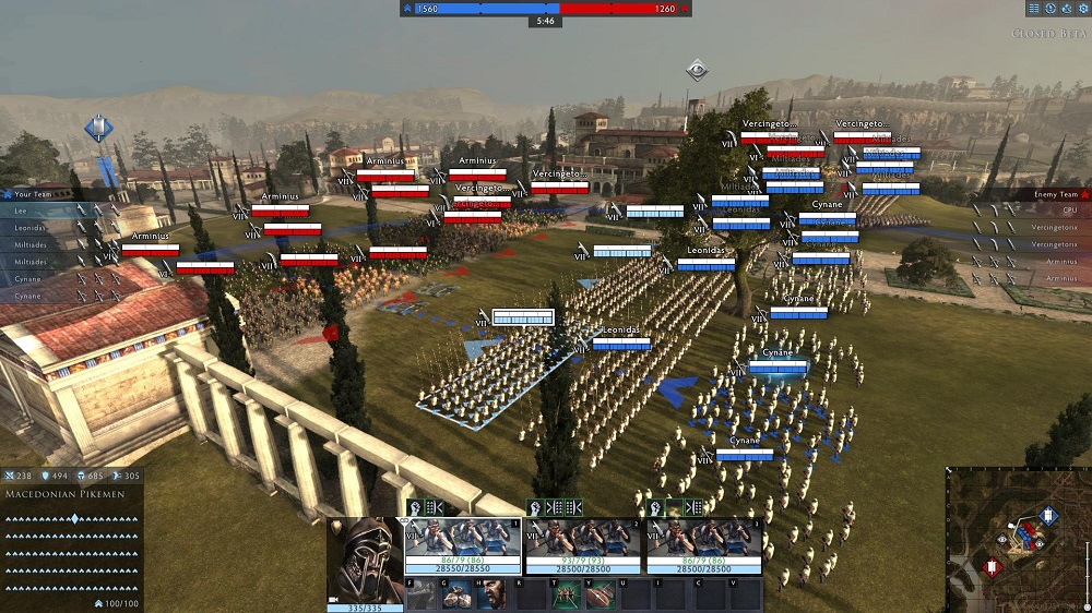 Организована игра по схожей с Rainbow Six: Siege схеме. На выбор у тебя есть 4 фракции (Римляне, Греки, Немцы, Варвары), в каждой из них по 3-4 известных полководца, со своими скиллами, юнитами и уникальными ветками развития. Изначально у тебя на руках имеется один выбранный в начале игры полководец. Но со временем, зарабатывая в сражениях славу и деньги, ты можешь прокачивать имеющегося героя и покупать новых.Total War: Arena находится в стадии открытого бета-тестирования, поэтому на данный момент в игре присутствует лишь два режима боя: против ИИ и против живых соперников. В PvP схватке вам нужно захватить точку противника и не дать захватить ему вашу точку. У каждого игрока в наличии имеется три отряда по 100 человек – довольно небольшая армия для привычных масштабов Total War. В зависимости от того, какого персонажа ты выбрал перед началом сражения, будет зависеть сет твоих юнитов, а уже от них будет зависеть твоя тактика на поле боя.