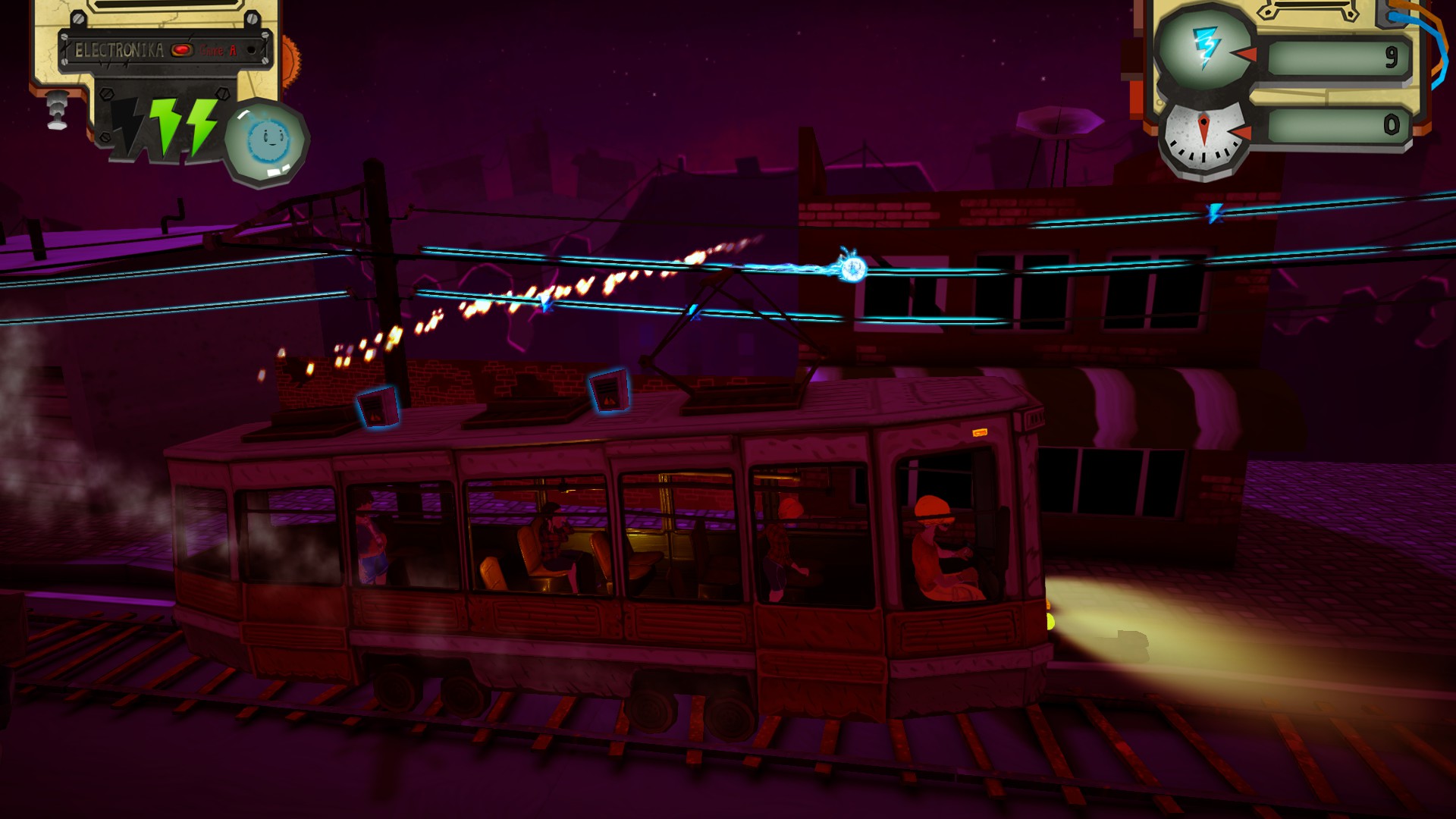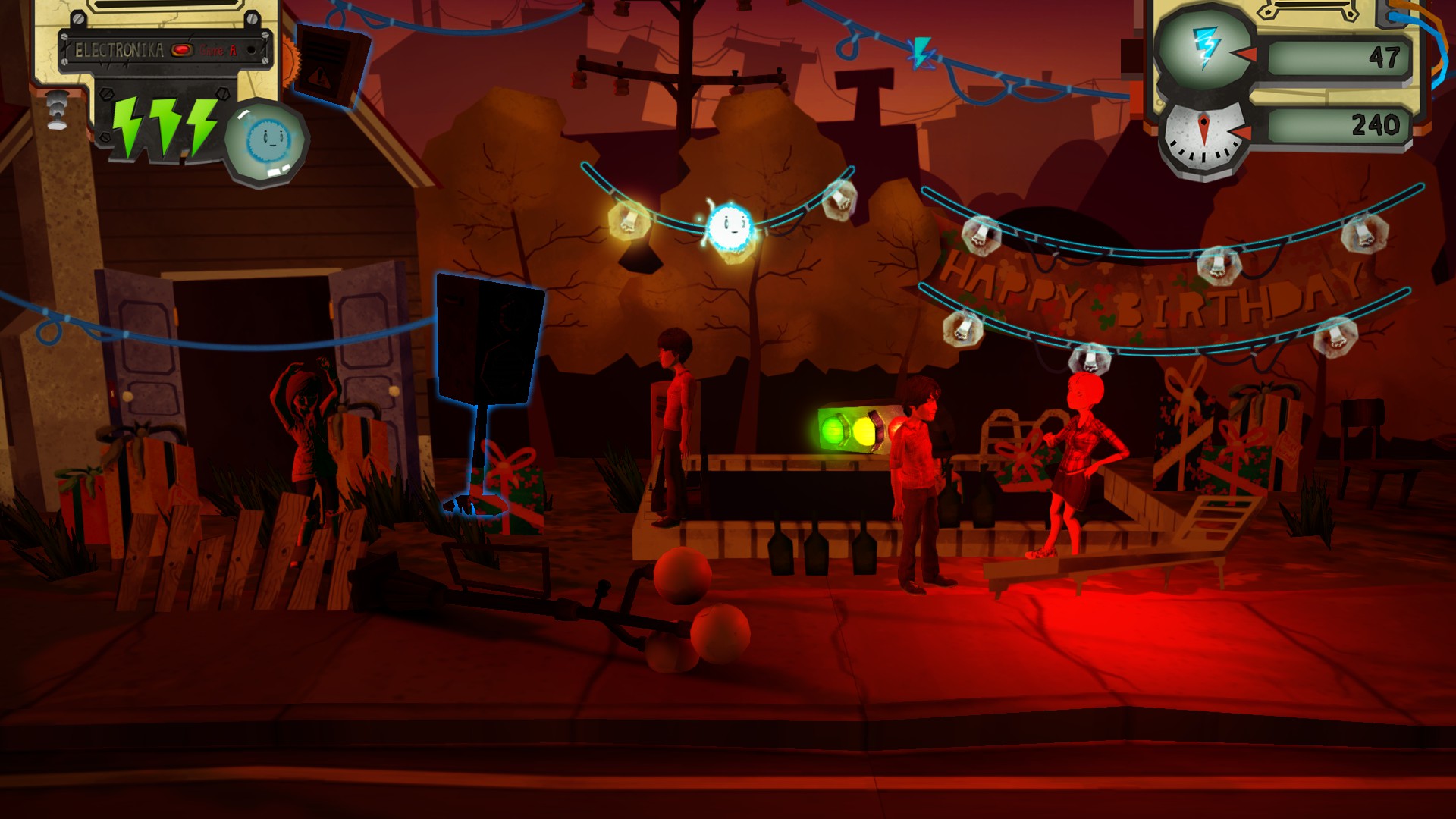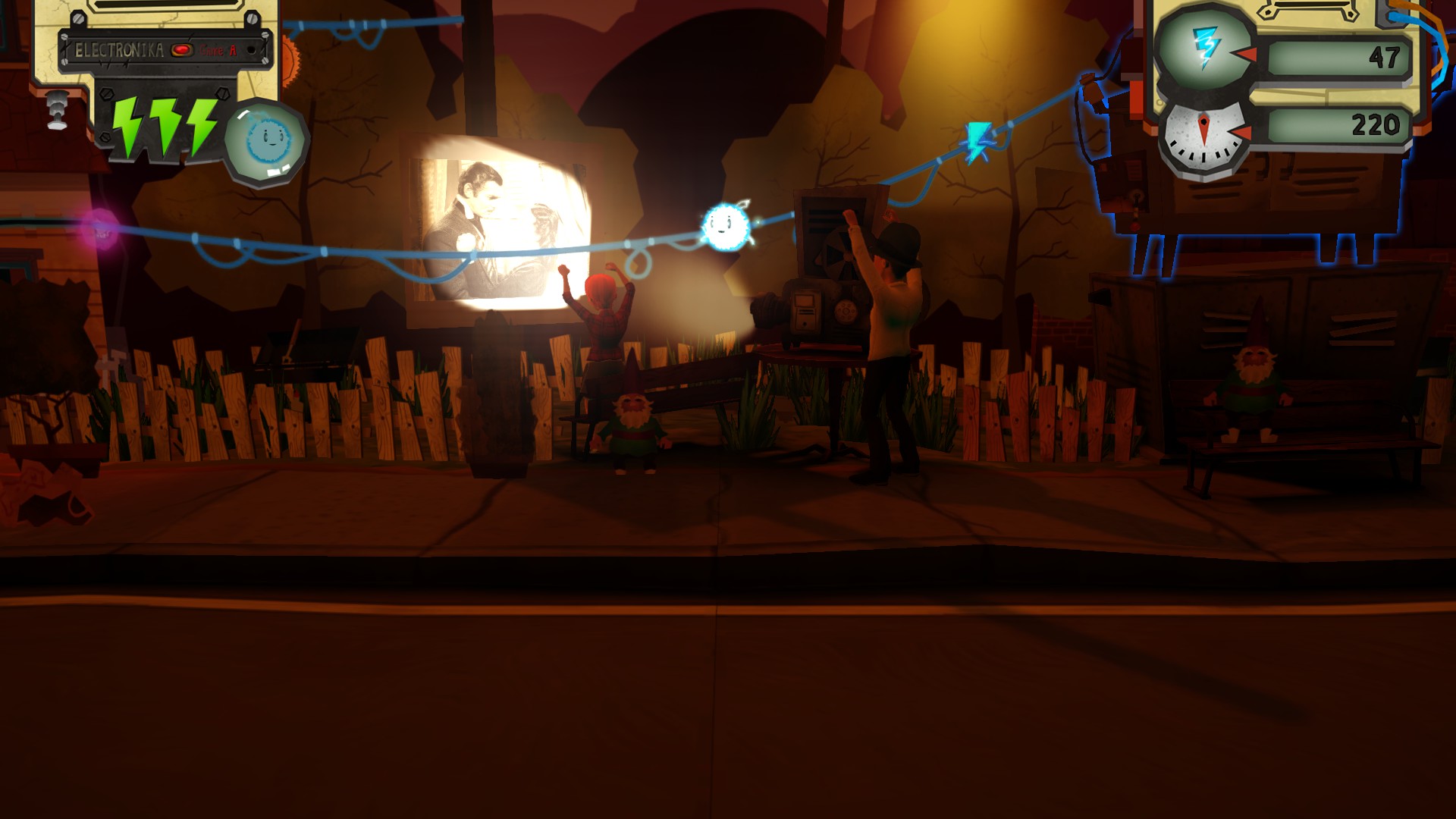 Вот девочка окаменела, не решаясь пройти по темной улице, – окей, поможем. Вон молодежь впала в уныние на прервавшейся вечеринке – хорошо, вернем им музыку. Тут вандалы жгут книги, а там – мародеры ввалились в супермаркет. Разберемся! Инопланетная молния носится от проблемы к проблеме, перемещаясь по городским кварталам на автомобиле ученого, оборудованном электрогенератором. Что интересно, перед нами не привычный платформер: быстро понимаешь, что уровни раздаются в глубину (как в Valiant Hearts: The Great War).