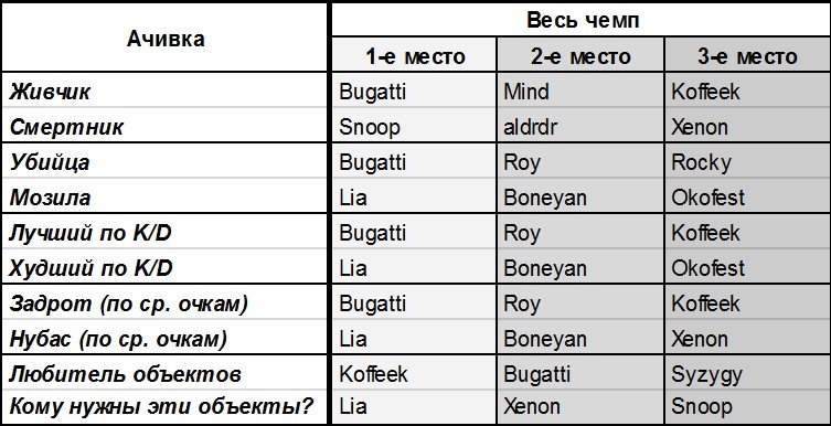 В общем сами итоги и небольшая статистика собранная за турнир, которая возможно поможет оценить игроков в следующих турнирах.