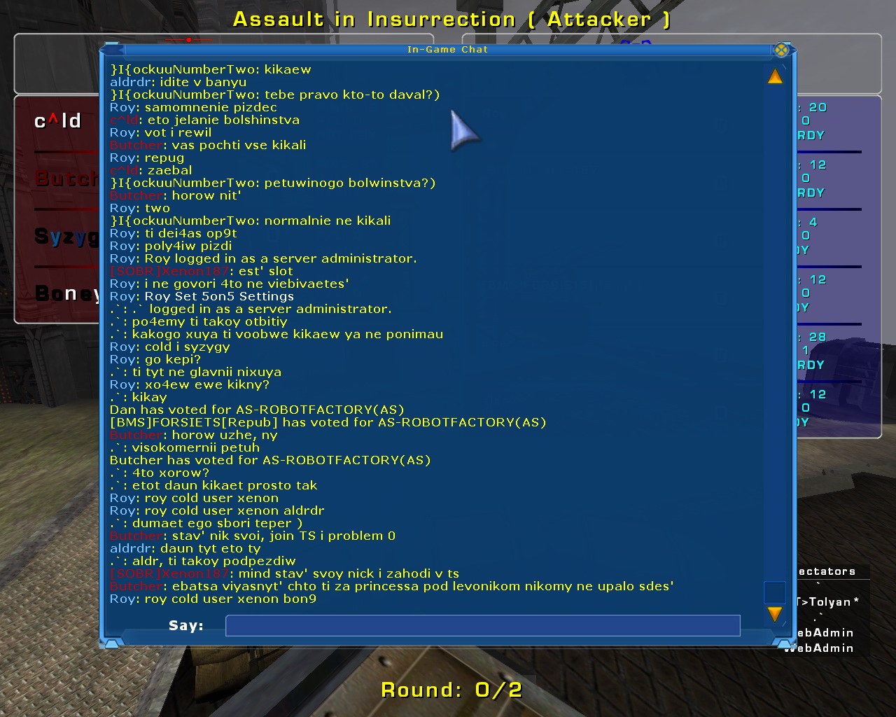 Когда я описал ситуацию 51му и попросил чтобы он выдал админку одному или нескольким наиболее активным ассолтерам для удобства проведения сборов - также как на КТФ-сборах есть свой админ - он сказал что надо провести опрос среди ассолтеров по поводу кандидатуры админа( я опустил подробности по поводу того что мы вообще недостойны своего играющего админа и недостойность ни моей ни Кофе ни Чонга кандидатур).