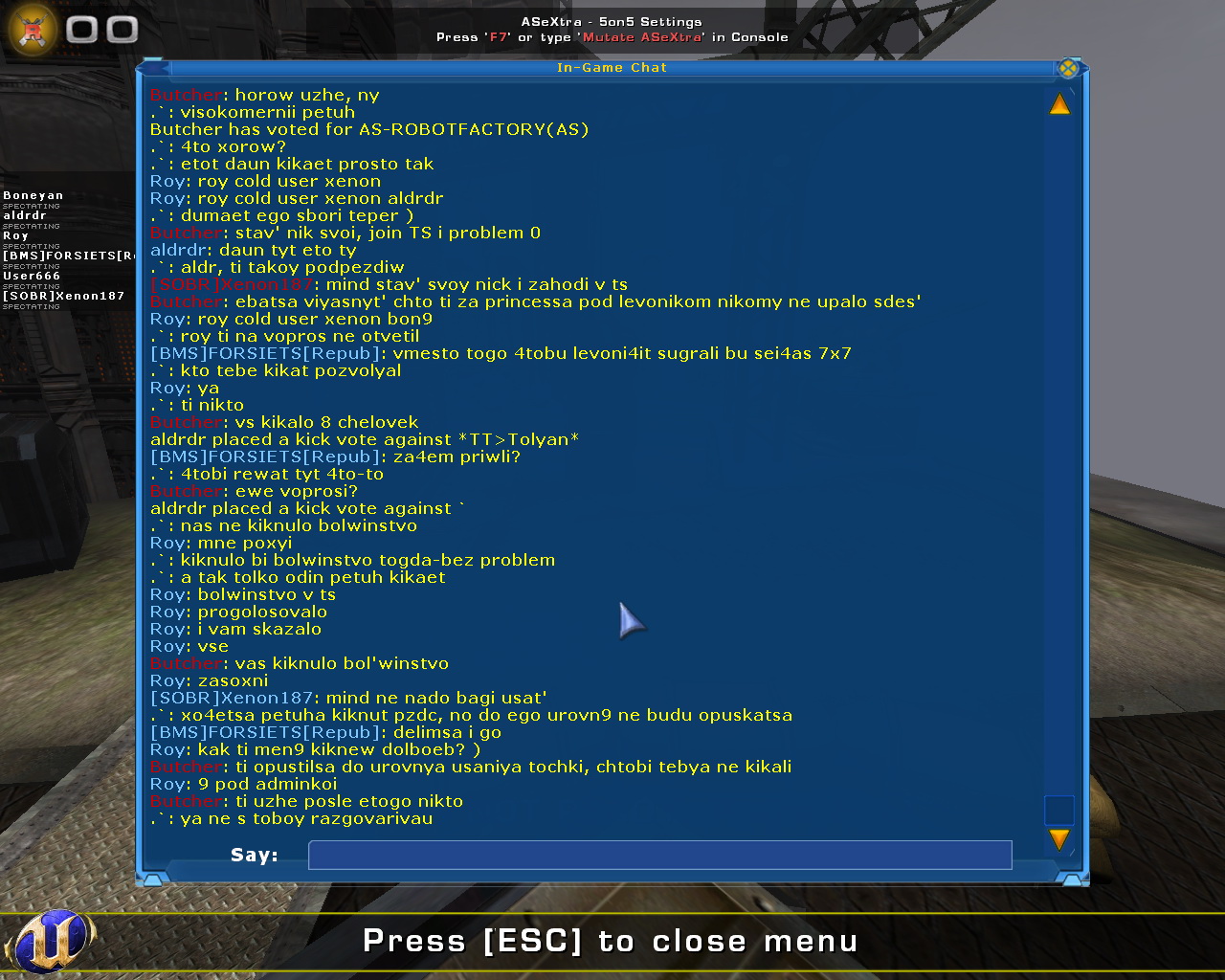 Пришли два фейка, зашли в игру говоря что идут только комплектом, в одну команду. На вопрос кто такие, отвечали что не местные, мол из ут99 и вообще нубы. На то что люди не хотят терять время на весь этот маскарад, а хотят сделать баланс (что невозможно когда заходят вот такие вот задроты под фейками) и уже нормально поиграть - им естественно положить. В итоге после уже первой карты и на протяжении второй, где из-за них был дичайший дисбаланс, их начали кикать, в итоге собственно это было доделано админ-киком(замечу все почти половина народу на серве их и так кикали и остальные были в ТСке за кик админкой без вопросов). После этого задроты под фейками зашли в спек и начали требовать чтоб им дали сыграть, им сазали что пока есть нормальные люди для пугов они сидят курят и вообще с ними играть никто не хочет. Если вы особенные такие, не как все - ну так и сидите в сторонке. В итоге те начали сраться со всеми подряд, за что народ их продолжил кикать и админкой я их опять докикал. Никто из присутствующих на сервере не был против - это такие люди как Aldrdr, Tolyan, Butcher, Cold-Mind, Dan, User666, Xenon, Syzygy - в общем подавляющее большинство( я более того скажу - еще на первой карте где из-за них был дикий дисбаланс и в перерыве между первой и второй большая часть людей была за то чтобы кикнуть этих особенных сразу, но как раз я убедил народ попробовать сыграть с ними и даже дать им играть в одной команде). То есть админкик как результат был не каким-то произволом админа( лично меня) а всего лишь выражением воли большинства на серве. То же самое что и кик вылетевшего игрока и ревот мапы - просто для упрощения и ускорения процесса.