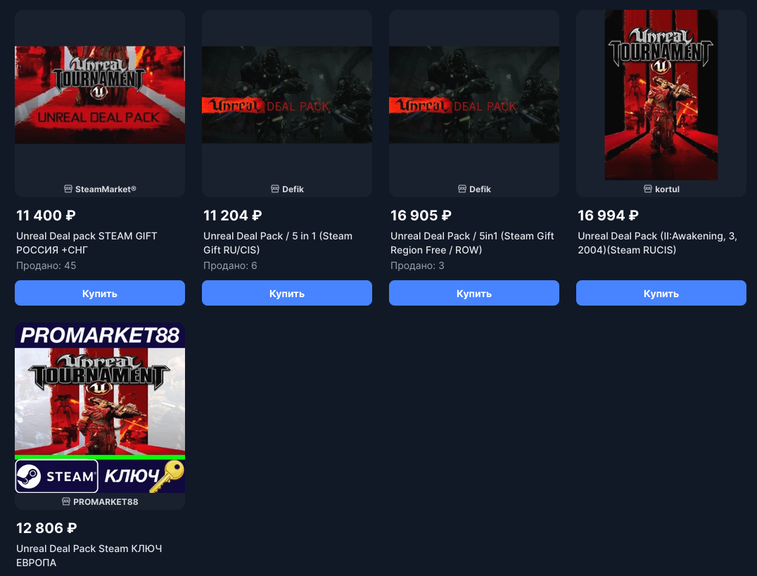 Игры серии уже несколько лет как изъяты из продажи вообще везде. Epic'и даже у себя их перестали продавать. Можно по идее еще найти последние "дефицитные" ключи со сборниками Unreal Deal Pack на сторонних площадках, но там цены "конские", т.к. барыги их продают. И чем больше времени проходит - тем ценник выше... Ну а теперь Epic сами разрешили качать с сайта ребят из OldUnreal установщики оригинальной первой части Unreal + UT2004. Сами же они их официально не поддерживают. Но серваки любительские в UT еще есть "живые" - народ играет до сих пор. Теперь людей там еще больше будет, т.к. раньше не на все серваки пускали с пиратских репаков: с некоторых серверов выкидывало, если использовался репак со стандартным пиратским cd-key номером. Сейчас, думаю, с орининальным образом пропатченным везде можно будет поиграть. Ну а вот ценники на последние ключи у барыг: