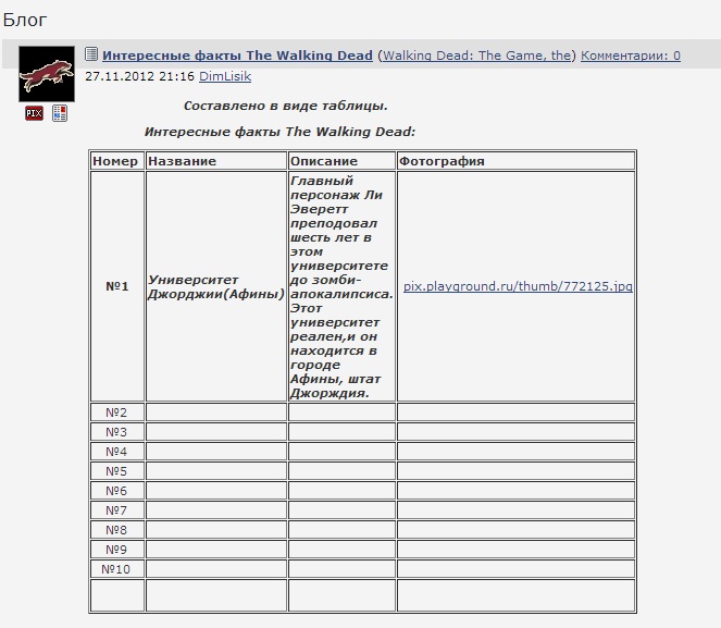 | Университет Джорджии(Афины) | Главный персонаж Ли Эверетт преподавал шесть лет в этом университете до зомби-апокалипсиса. Этот университет реален,и он находится в городе Афины, штат Джорджия. |