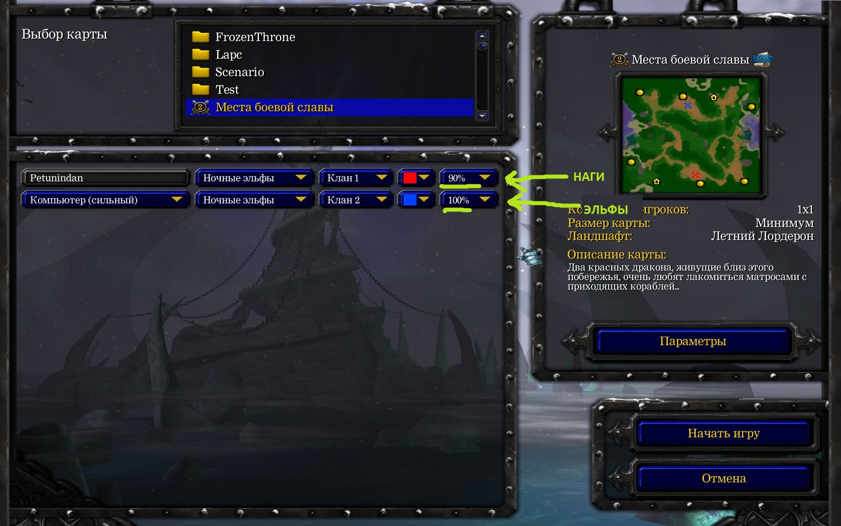 Файл из архива NagaMod.exe положить в папку с игрой (например D:\Games\Warcraft III), запустить игру через этот файл, выбрать ночных эльфов и поставить фору на 90% (если поставить на 100 играем за эльфов).