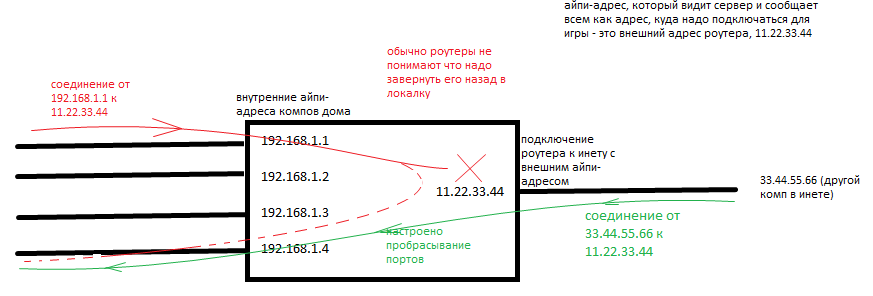 Когда создает игру машина, на которую осуществлен проброс портов - другие игроки заходят в игру. В том числе и игроки соседнего дома (пример подсети).НО другие компьютеры данной локалки войти не могут.
