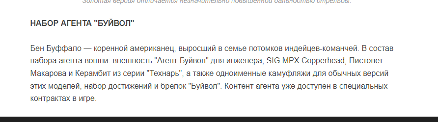 Новый агент уже доступен в игре! Ряды инженеров пополнил Бен Буффало — агент "Буйвол", индеец-команчи из Канзаса, который в молодости увлекался футболом и боксом, а во время службы в армии смог заинтересовать сотрудников правительственных служб, после чего вступил в ряды секретных агентов. В течение пяти лет о нем не было ничего слышно, пока однажды Бен не вернулся в родной Канзас. Он думал, что сможет обрести покой, но судьба распорядилась иначе...
