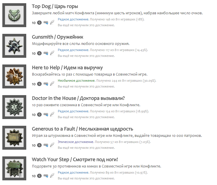 Достижения к игре были довольно интересные (их меньше, чем в ПК-версии), приходилось обильно играть в PvE и PvP + выполнять контракты. Самым сложным оказалось получить по 20 лент, отметок и значков. Взять хотя бы ленту за то, что нужно на сверхсложной миссии убить 5 джаггеров саперской лопаткой. С бразильцами или другими рандомами сделать это было просто невозможно.