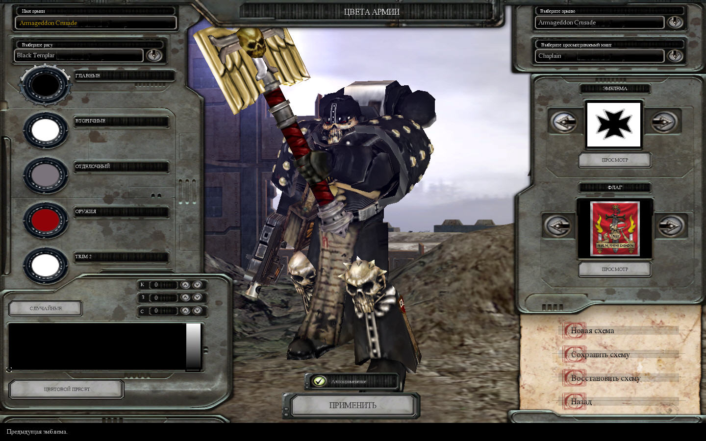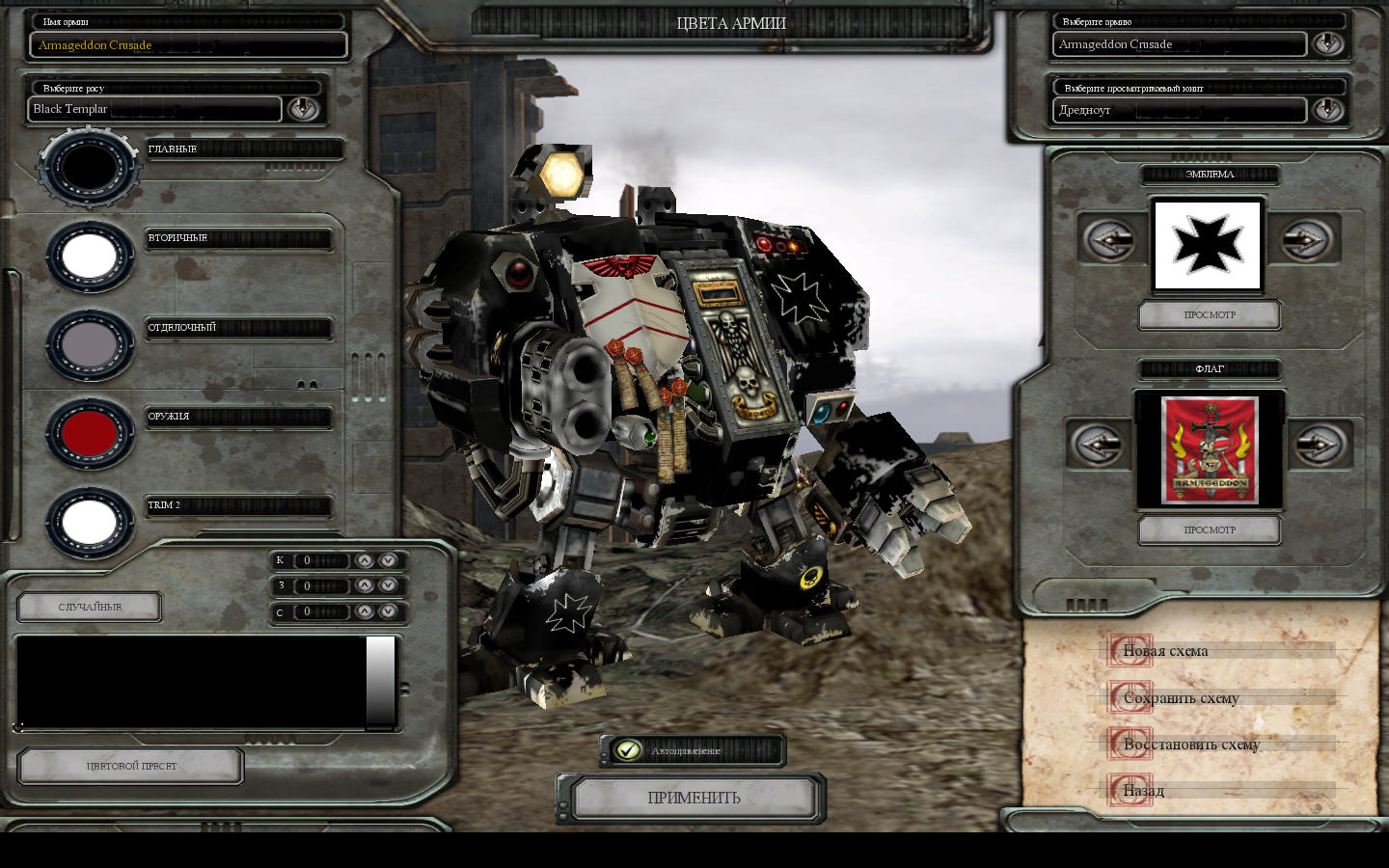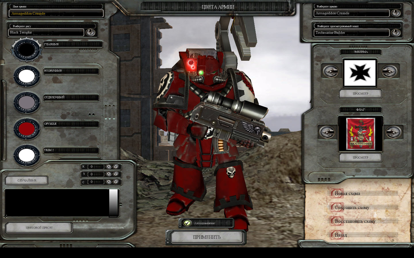 Версия, считайте что бета. По этой причине - язык только английский. Как ставить: 1. Установить Advanced Skirmish AI 3.2 2. Распаковать архив с модом в каталог с игрой. (Только Соулсторм. На Дарк Крусейд не запустится) Как патчить: Ссылка на патч и инструкция - на форуме мода. Основное что исправляет патч - восстанавливает отображение "душ" при игре за Д.Э. Ну и по мелочи немного... to: Иван Крутой Cкрины делать не умею. Зато ИИ программировать умею. В следующей версии - кампанию обновлю слегка. Можно будет наказать Кровавых Воронов за ересь. Подробности на форуме. Кстати, men - это во множественном числе существительное. to: ZeNoN215 А ты что ожидал увидеть? Встречный вопрос: Слышал что нибудь о настольной игре Вархаммер 40К и о кодексах? О кодексах Черных Храмовников, Темных Ангелов, Кровавых Ангелов, Космических Волков? Расстрою - они все космодесант, только другой, а не обрезанный. Мод сделан в соответствии с кодексом Ч.Х. + балансирован относительно Cоулсторма. Анбэка не ждите.