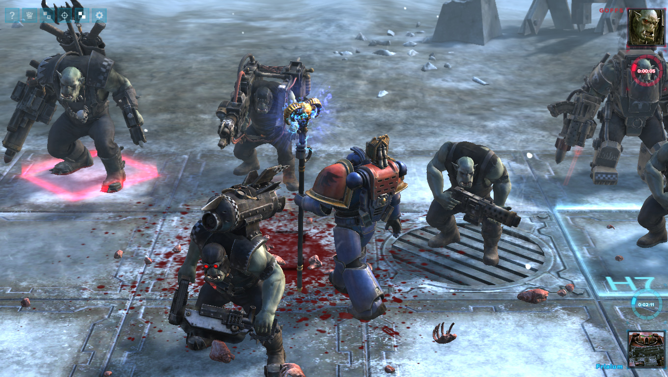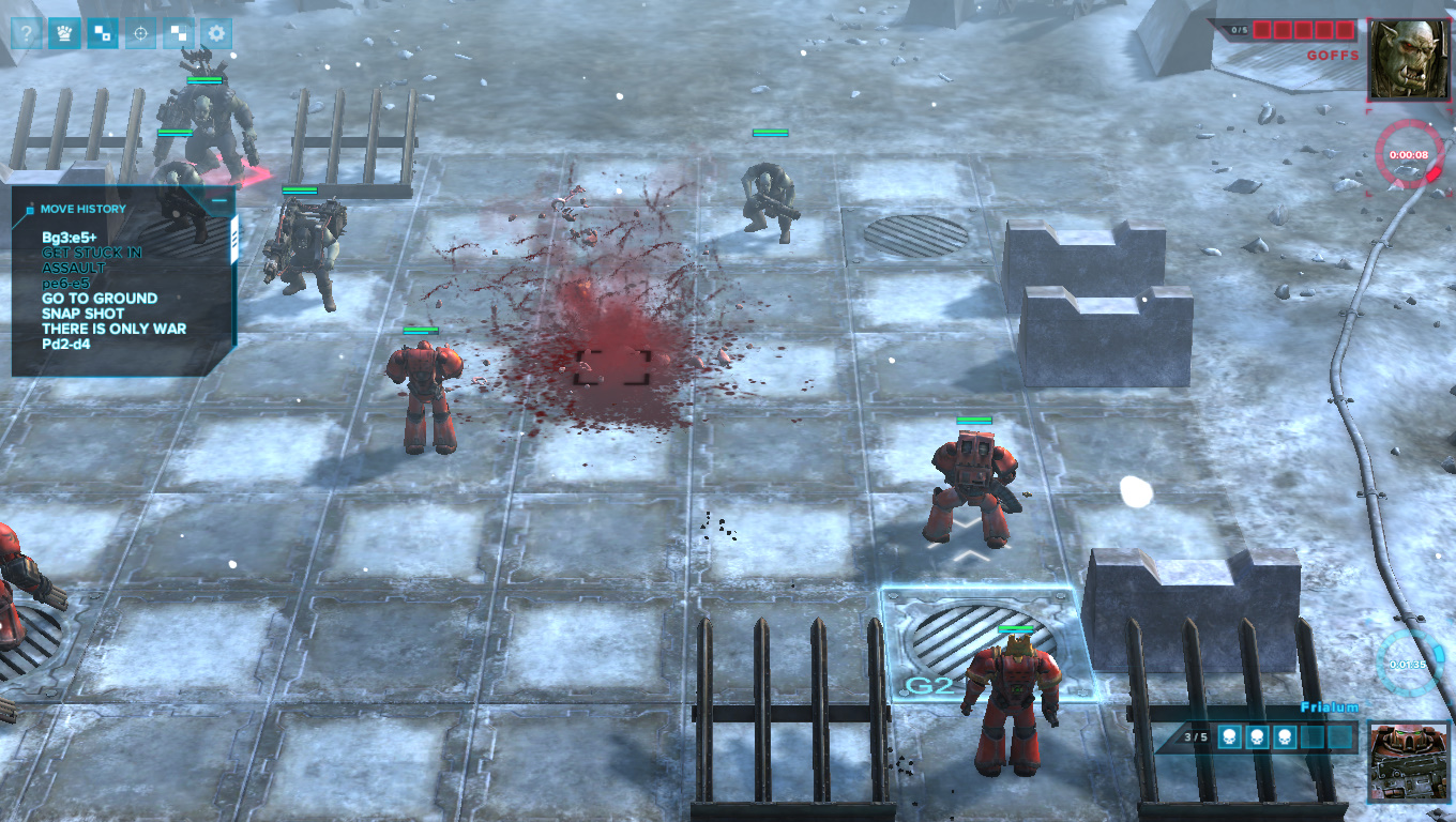 Режим регицида гораздно интереснее. Поначалу может показаться, что изменений нет: и поле то же самое, и фигурки ходят так же, как в шахматах. Но на этом схожести заканчиваются. Поймете вы это в тот момент, когда в ваши стройные ряды начнут лететь гранаты. По сути, игра превращается в полноценную тактическую стратегию с элементами настольной Warhammer 40K. Так, на поле боя можно выставить любое количество разных десантников или орков в пределах максимально допустимого значения. Кроме того, вместо классического показателя здоровья здесь используются «раны» и единицы брони из настолки.