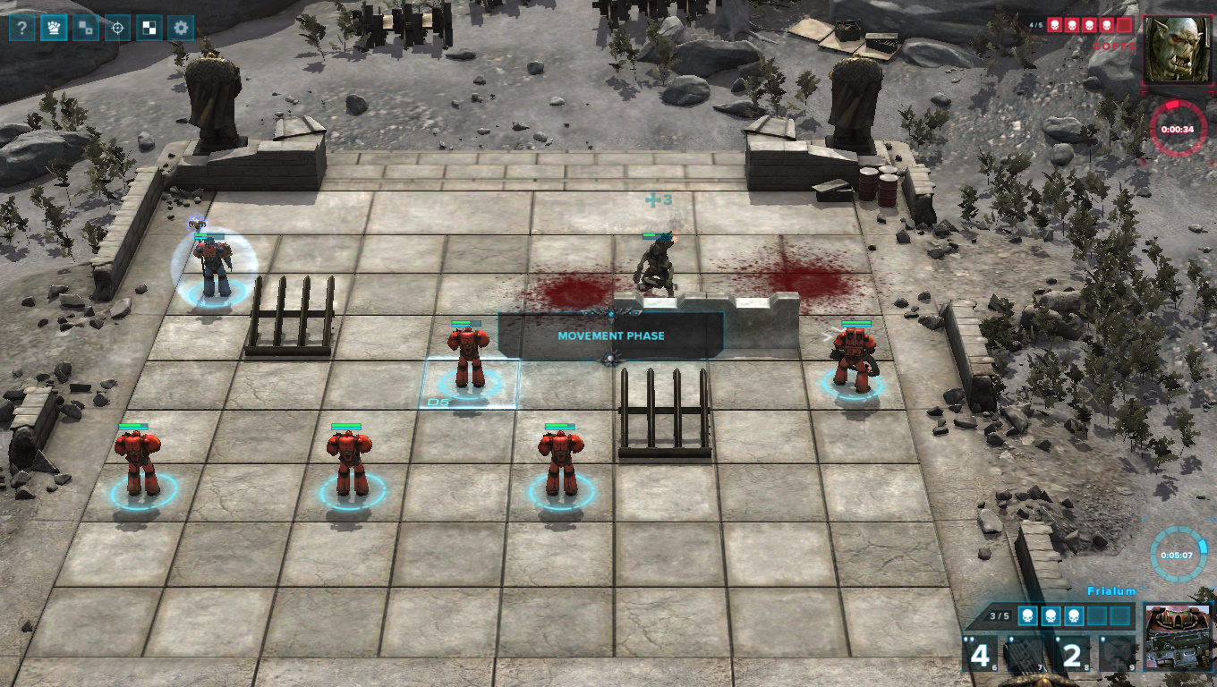 Есть в регициде и фазы боя. В первой фазе можно передвинуть одного вашего воина. Пешки, которые здесь представлены рядовыми астартес, могут ходить лишь на одну клетку и только вперед. Офицеры с тяжелым оружием «бегают» по диагоналям. При этом, как и в обычных шахматах, если на пути передвижения окажется противник, то убить его можно моментально.