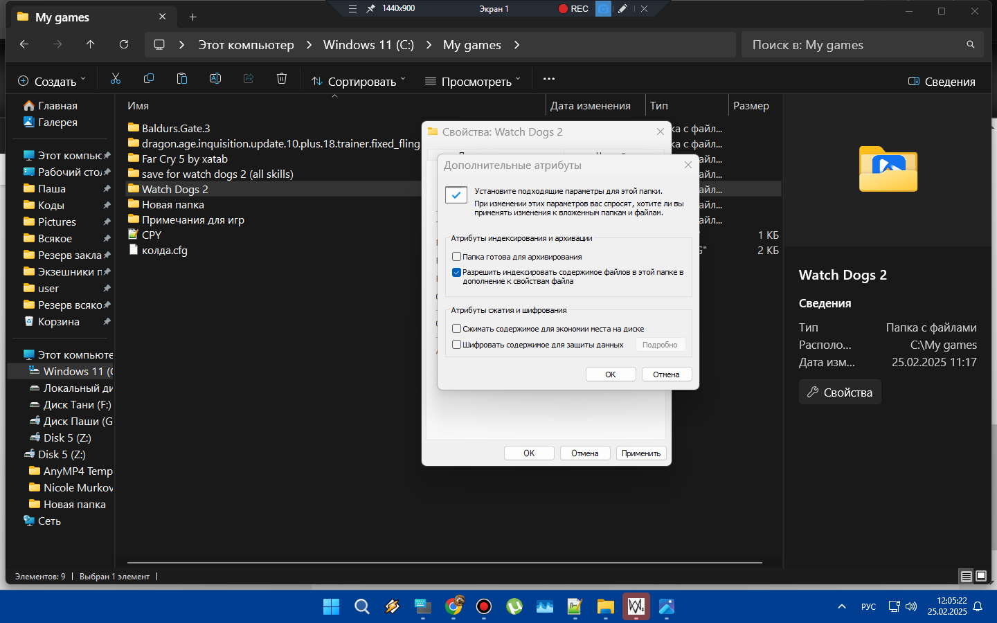 Потом разрешить индексирование для всех вложенных папок и файлов. Там же в свойствах нажимаем другие и выскакивает окно