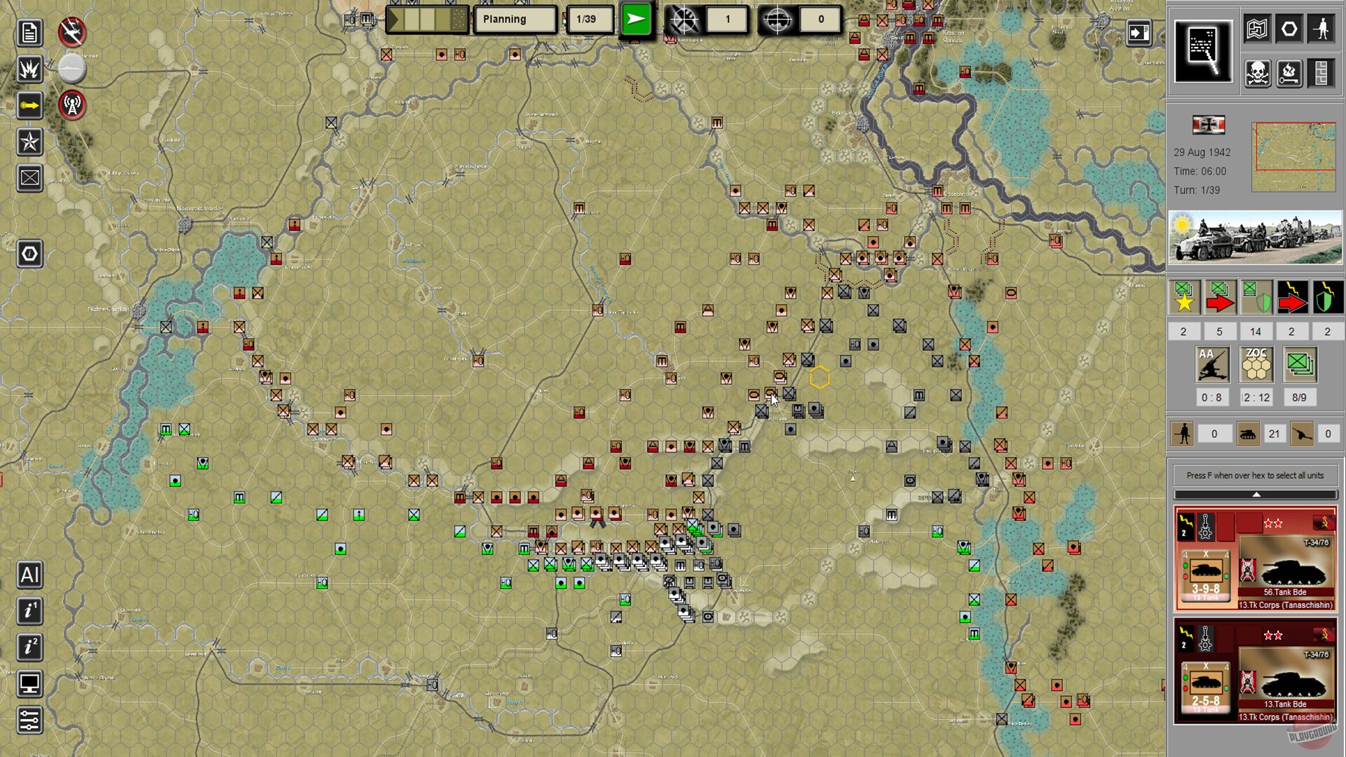 Гексовый варгейм про немецкое наступление на Сталинград в 1942 году. Сделан на движке более ранней Desert War, но тут есть одна интересная особенность — система WEGO, которая работает не как обычно. В большинстве варгеймов игроки ходят по очереди: один двигает войска и атакует, потом другой. А здесь оба планируют свои действия одновременно, не зная что задумал противник, а потом все приказы выполняются синхронно. Приходится думать наперёд и готовиться к разным вариантам — ведь командиры в реальности тоже не знают заранее планы врага.