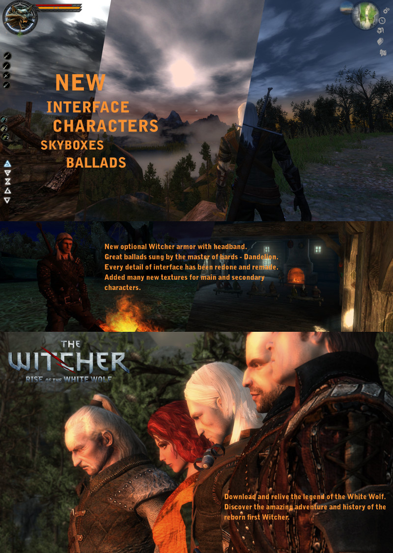 C уважением представляем вам результат усилий нашей команды, над которым мы трудились в течении двух лет. Изначально, мод "Ведьмак: восстание Белого Волка / The Witcher: Rise of the White Wolf" вносил небольшие изменения в интерфейс, а со временем наша работа стала чем то гораздо большим, - многие аспекты игры были изменены, кординально меняющие оригинальные. Что немаловажно в столь основательной переработке ванили, нам удалось сохранить атмосферу игры, представленную CD Projekt RED в далеком 2007 году.