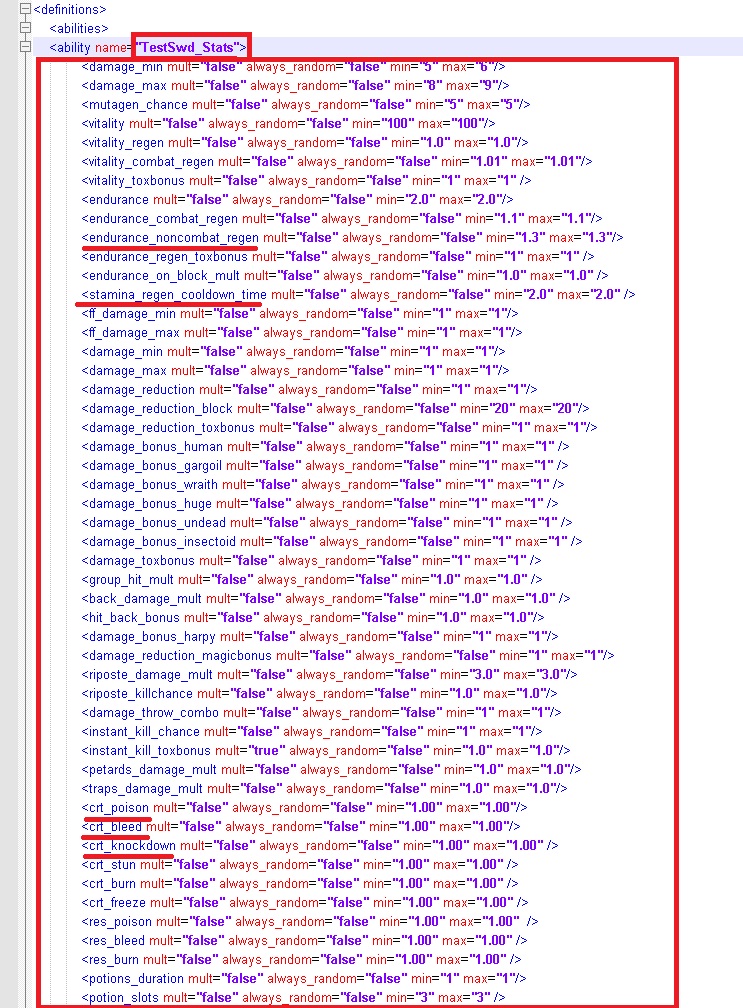 Это интересно: в файле tests.xml находится тестовый меч по имени TestSwd который собрал в себя все харатрестики существующие в игре. У него есть все: от Шанса вызвать Кровотечение до Улучшения Знаков. Так что можете подглядывать в этот файл чтобы узнать как называется та или иная характеристика.