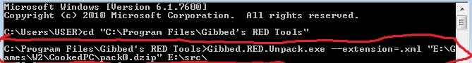 Нашёл способ легче! Без командной строки! Просто перетаскиваете "нужный файл.dzip" прямо на Gibbed.red.unpack.exe и всё! автоматически создается папка с содержимым файла dzip. Чтобы запаковать перетаскиваем папку которая создалась после первого действия на gibbed.red.pack.exe и у вас автоматически создастся "нужный файл.dzip"!