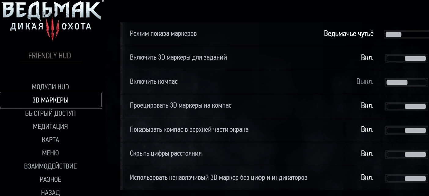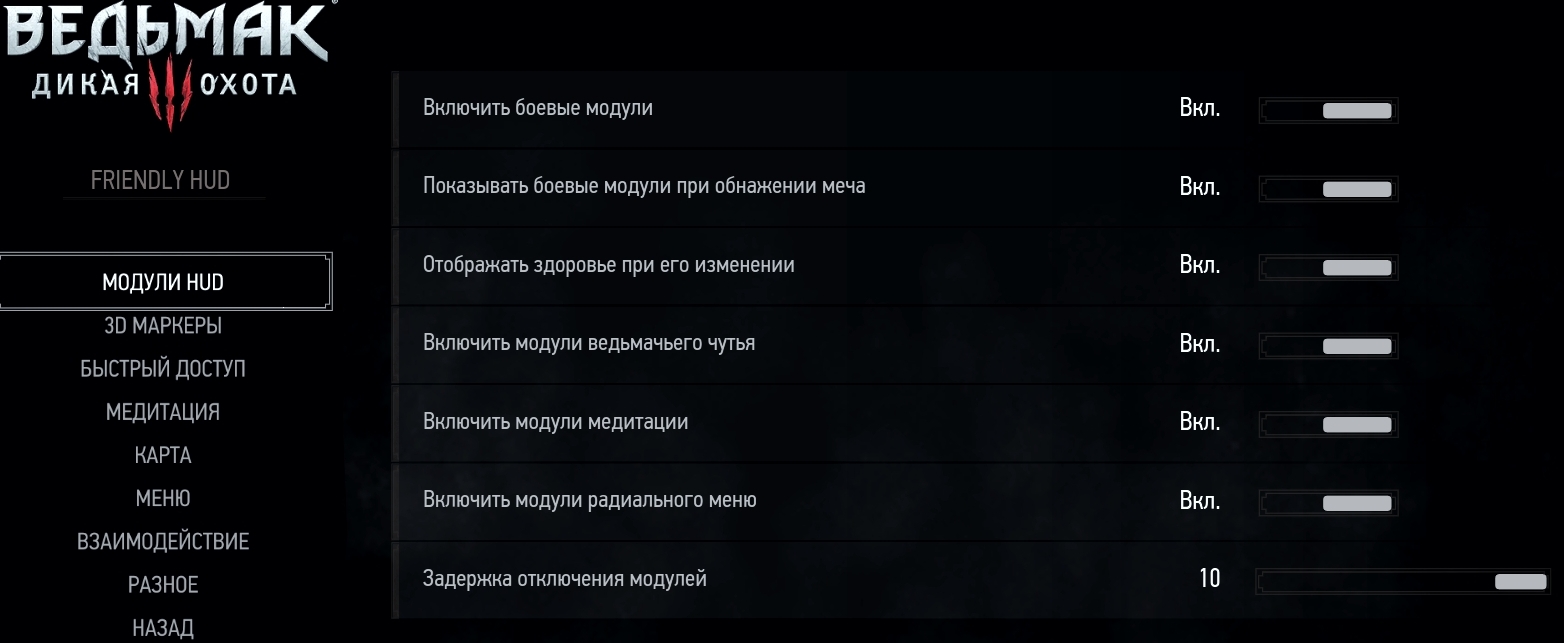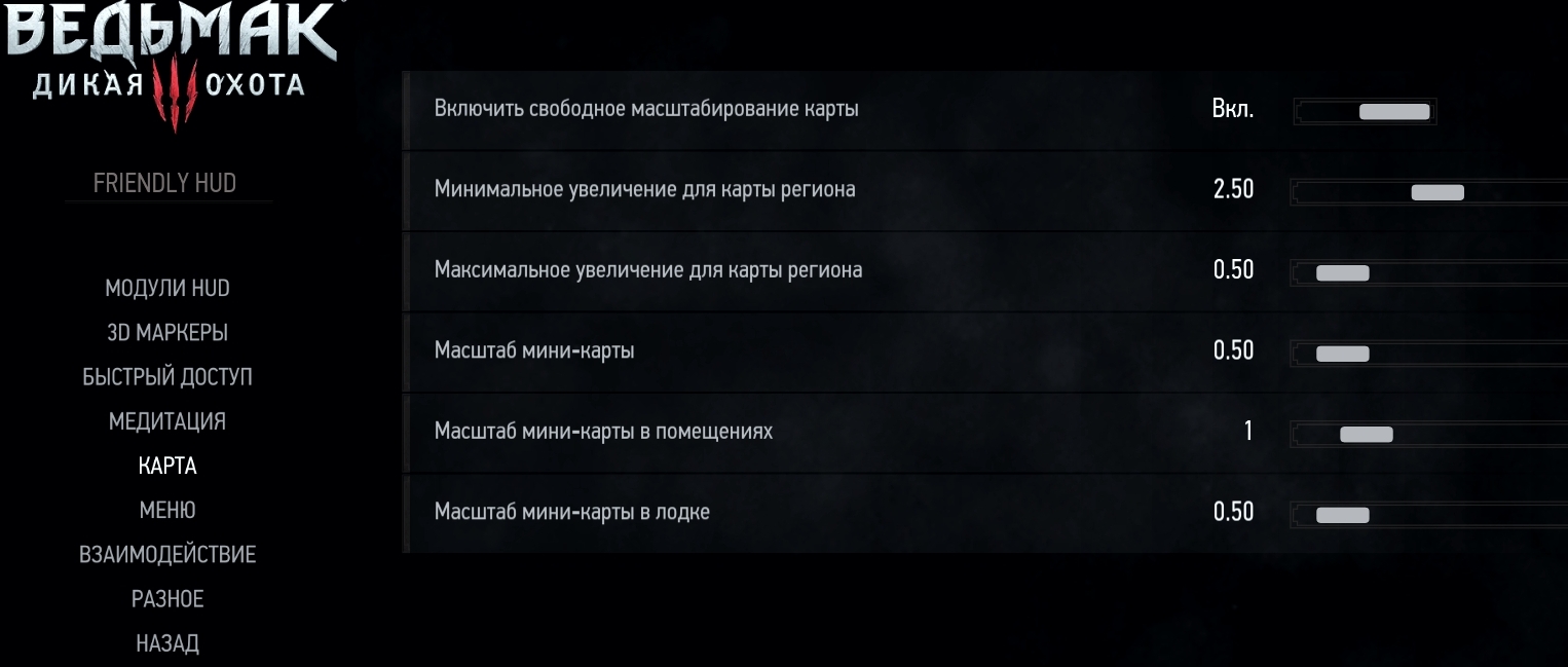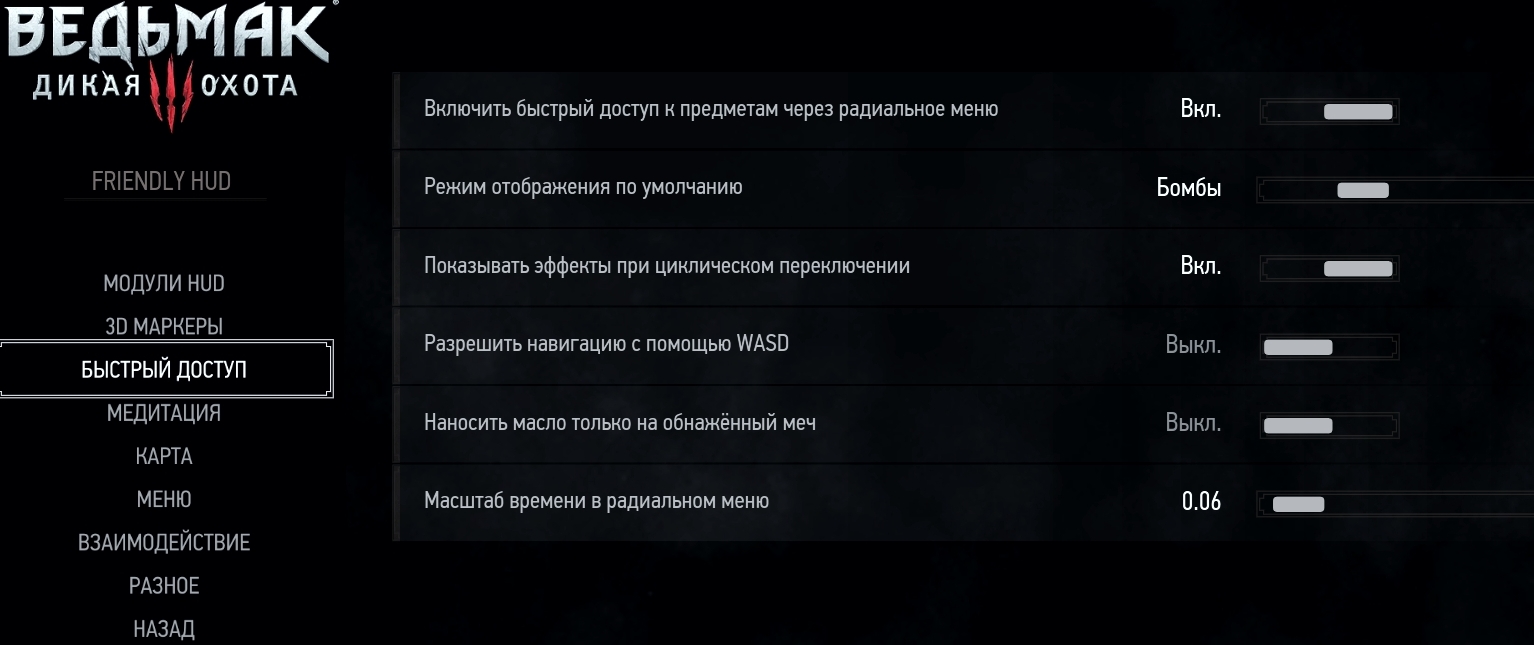 Списки модулей и быстрых предметов, шрифты и некоторые другие вещи можно настроить редактируя файл "[Путь куда установлена The Witcher 3]\Mods\modFriendlyHUD\content\scripts\game\modFriendlyHUDConfig.ws". При наличии минимальных познаний в области программирования можно легко поменять некоторые внутренние механизмы мода. Секция настроек начинается со строчки "Configurable section begin" и заканчивается строчкой "End of configurable section". Не меняйте ничего за пределами этой секции, если не уверены.