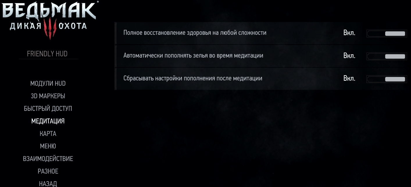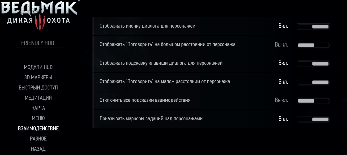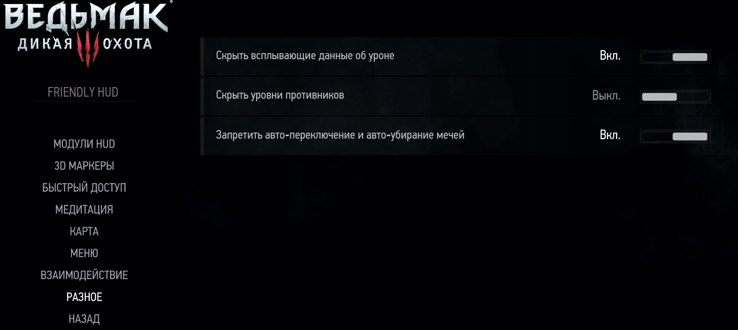 2. Для установки внутриигрового меню и горячих клавиш необходимо перейти в "[Path To The Witcher 3]\Mods\modFriendlyHUD" и скопировать папку "bin" в "[Путь куда установлена The Witcher 3]" с заменой файлов. Прим.: это действие перезапишет существующий "input.xml", поэтому если он ранее менялся под другие моды, не надо его перезаписывать, а надо открыть "[Путь куда установлена The Witcher 3]\bin\config\r4game\user_config_matrix\pc\input.xml" и "[Путь куда установлена The Witcher 3]\Mods\modFriendlyHUD\bin\config\r4game\user_config_matrix\pc\input.xml" и скопировать изменения modFriendlyHUD вручную (они помещены внутрь комментариев "modFriendlyHUD begin" и "modFriendlyHUD end"). После установки рекомендуется проверить, что оба файла - изменённый input.xml и modFHUDConfig.xml - присутствуют в папке "[Путь куда установлена The Witcher 3]\Mods\modFriendlyHUD\bin\config\r4game\user_config_matrix\pc".