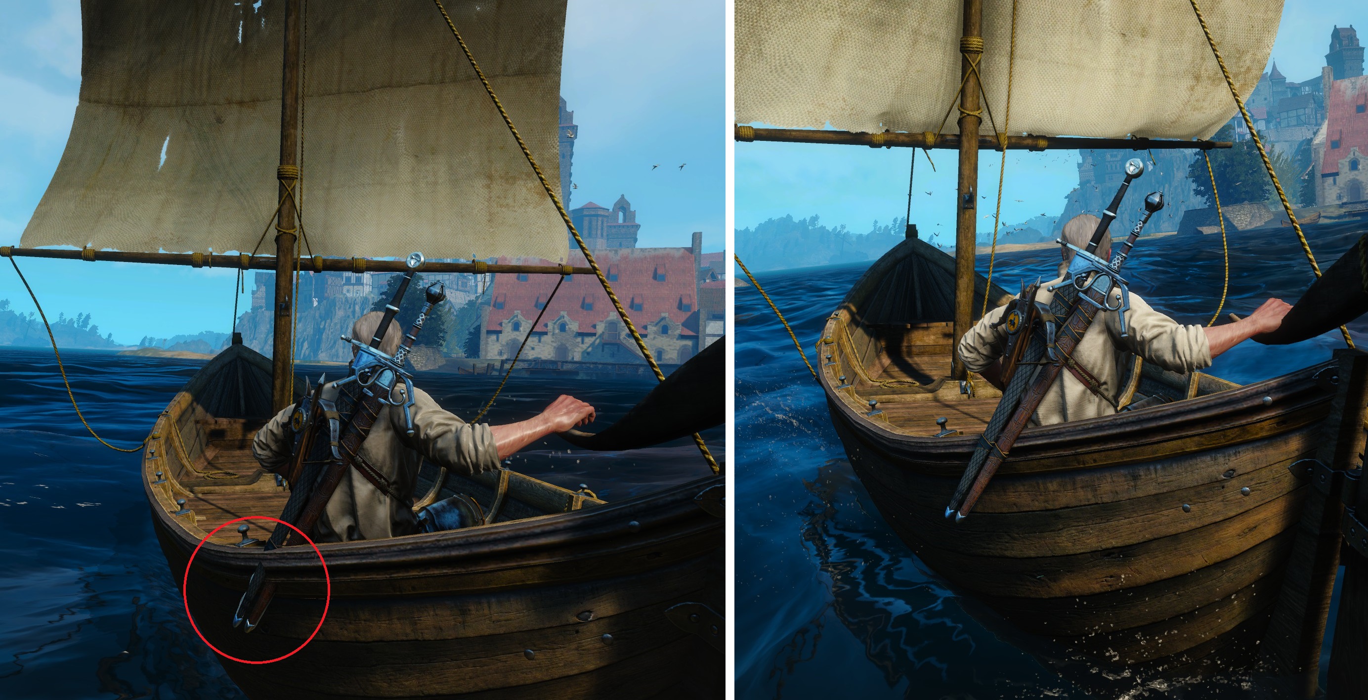 Вышла новая версия, там добавили исправление лодки, когда мечи геральта торчали при плавании, я загружу его выйдет завтра