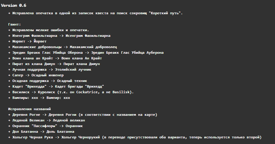 Список исправлений текущей версии смотрите на скриншоте 3 (исправления для дополнения "Кровь и Вино" помечены как [BW], исправления для дополнения "Каменные Сердца" помечены как [HS]).