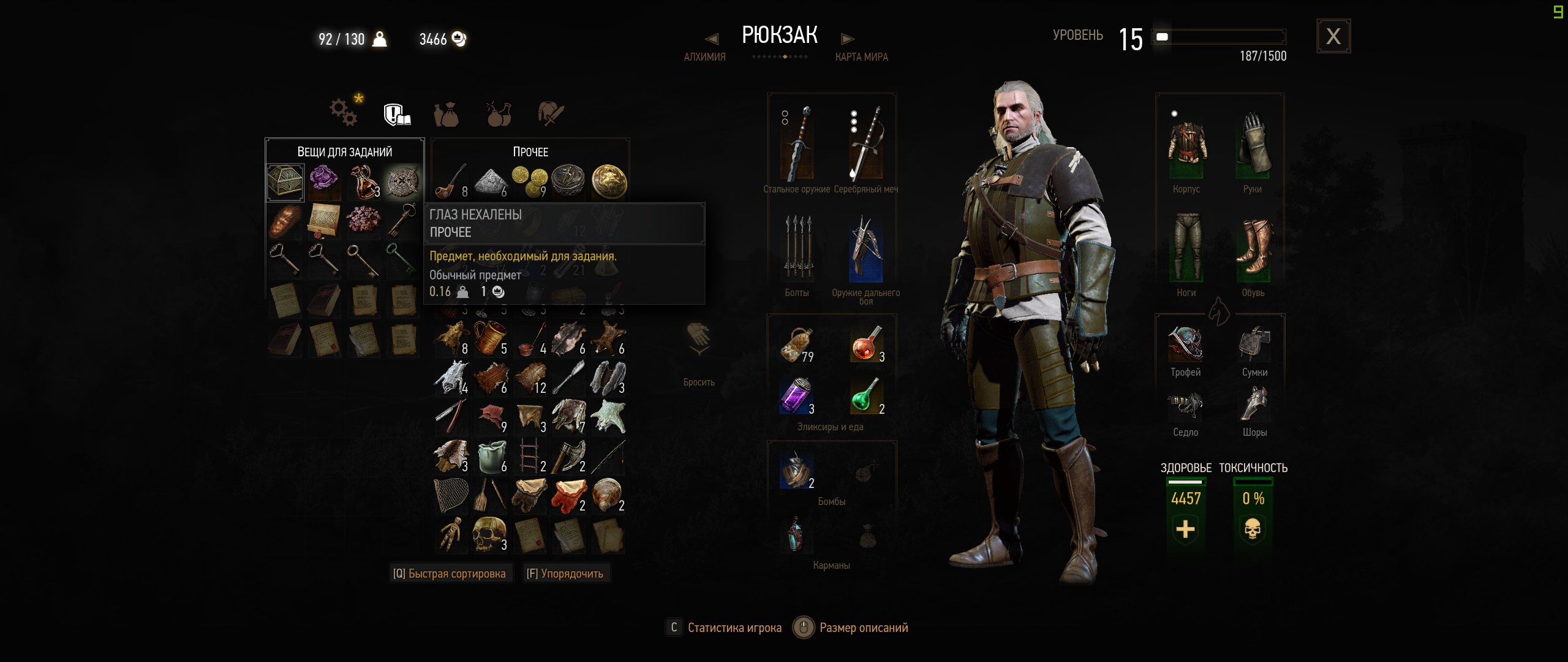 Я нашёл штаны, стальной меч, броню и сапоги и мне почему то квест засчитали. Потом я начал гуглить и нашёл место где находится серебряный меч. Там была полуночница 18-го левела я её благополучно одолел. Там была каменная стена к, которой надо было применить глаз нехалены. И как бы близко я не подходил всё равно не Геральт не хочет с ней ни как взаимодействовать. Я всё таки склоняюсь к тому, что это баг.