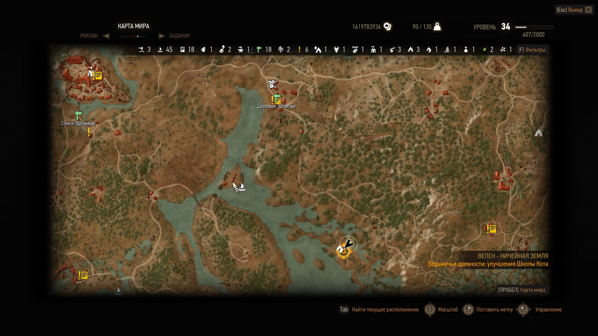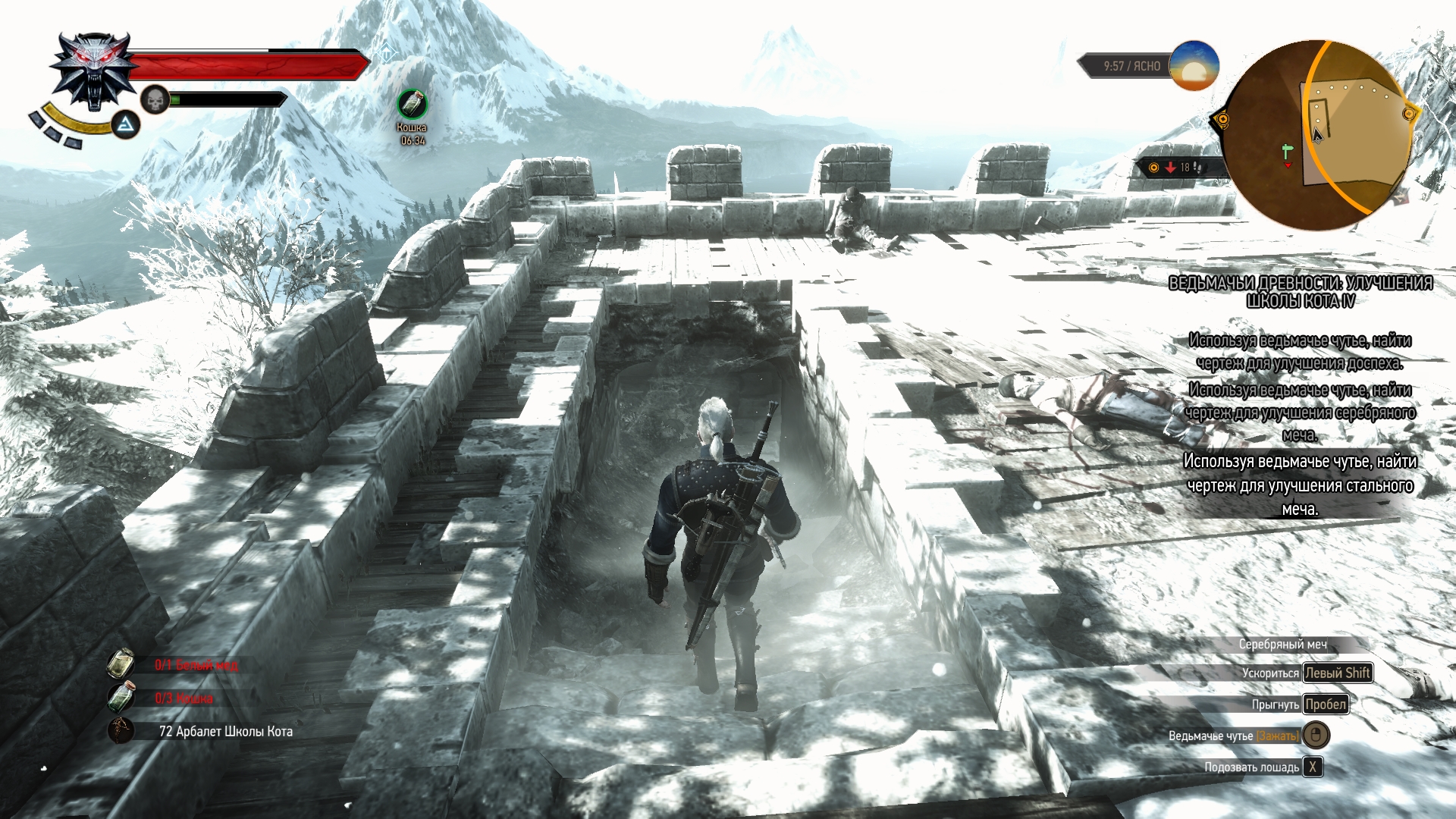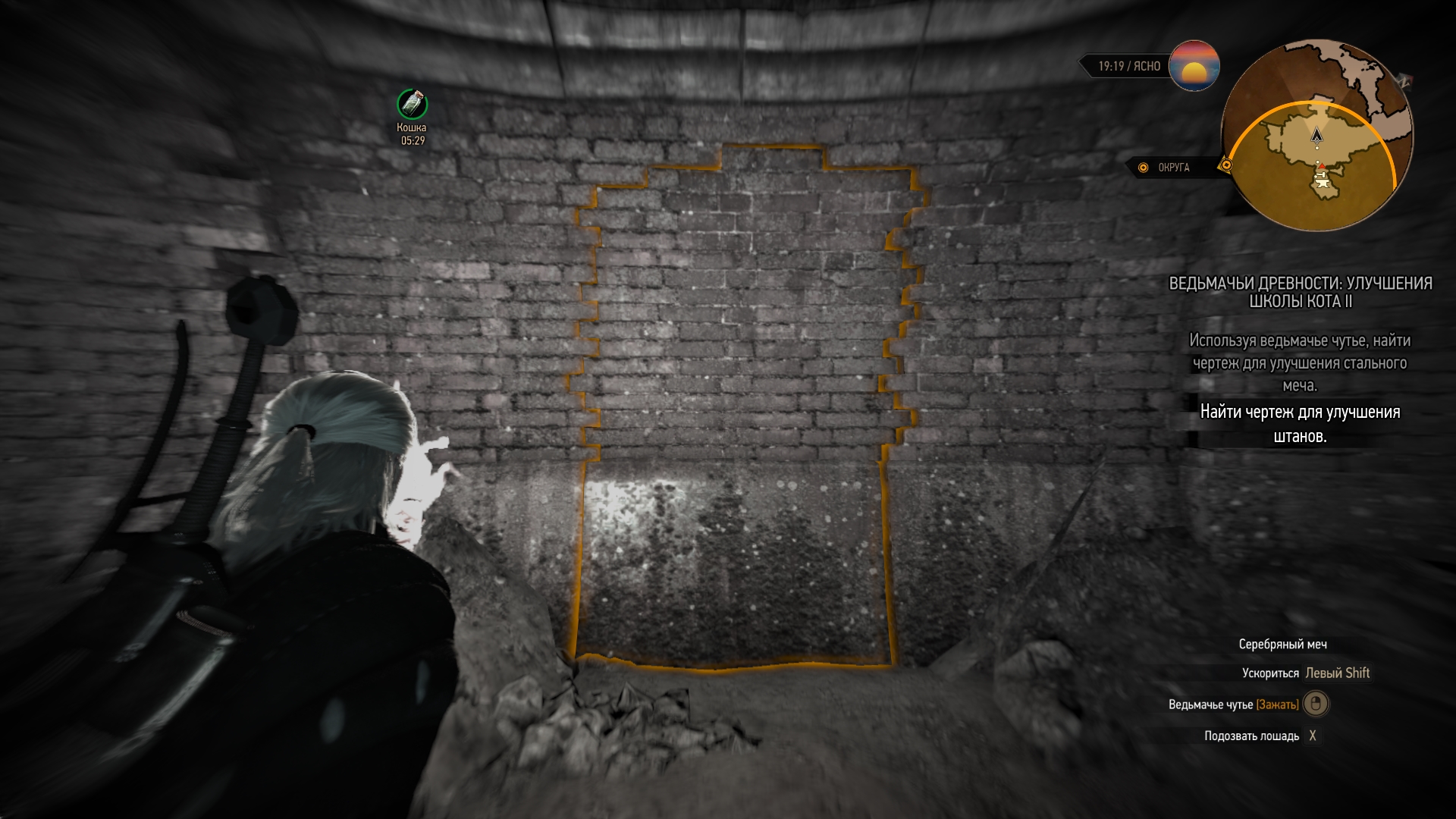 Далее отправляемся в "Харвикен". Эта точка находится на острове справа внизу. Мы перенеслись туда и двинули в сторону горы наверх. Там мы находим пещеру. Как всегда, в начале пьем эликсир "Кошка" и идем внутрь. Далее с помощью Аарда пробиваем стену справа и спускаемся вниз. Вуаля, там сундук с чертежем!