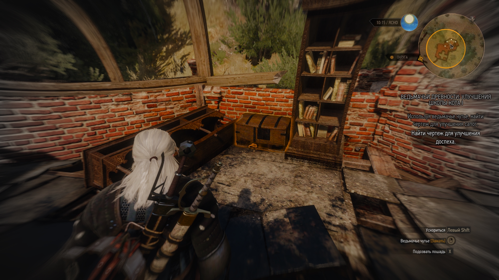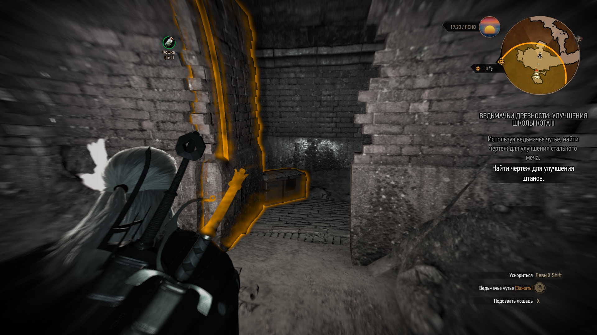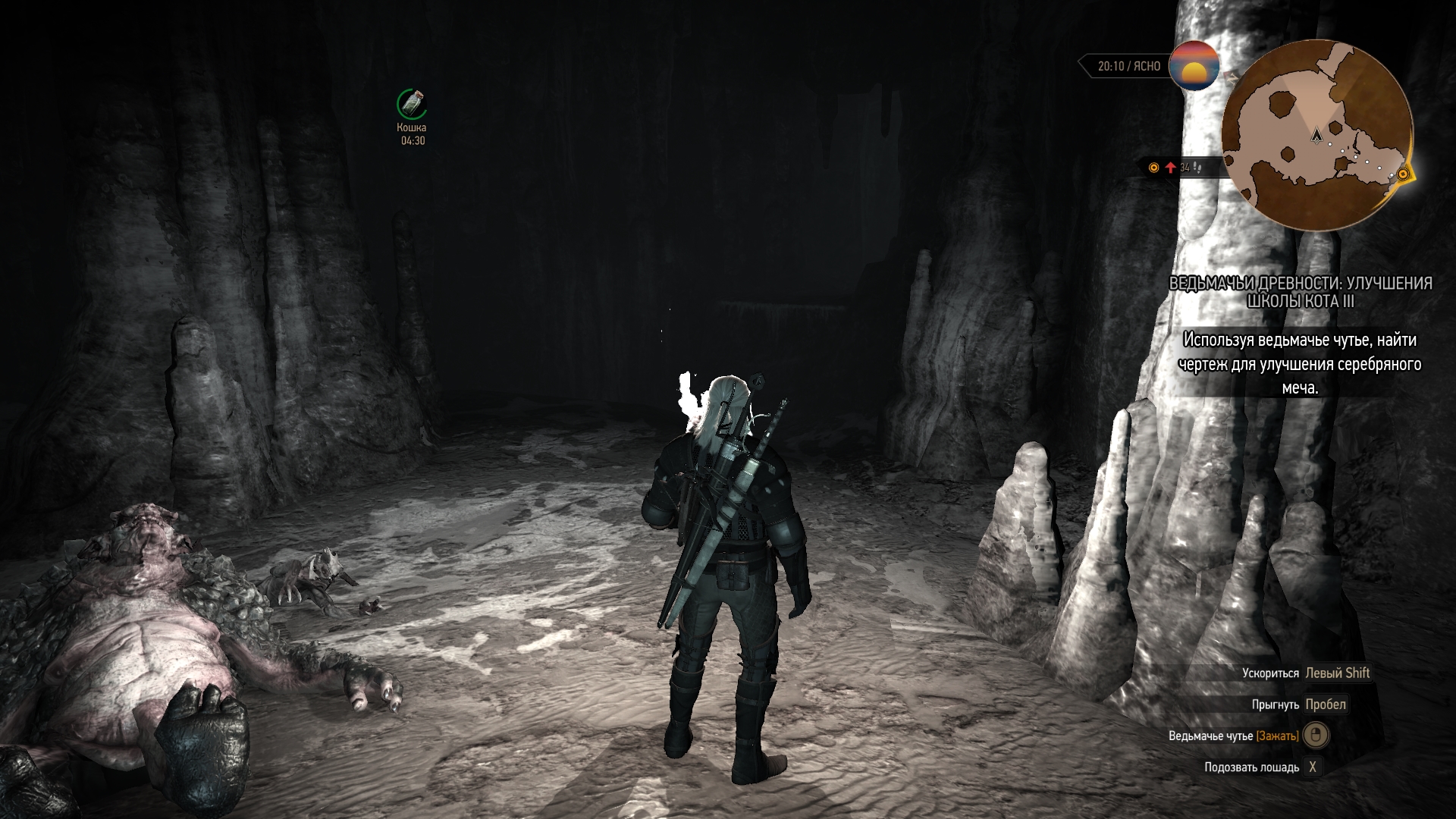 по пути на попадется стая волков. Рубим их и идем дальше. После того как дошли да точки мы видим пещеру(!!!осторожно, вокруг нее летает много Сирен!!!). Снова пьем эликсир "Кошка" и идем внутрь. Игнорируя статуи проходим вперед и видим туннель. Прямо на входе в него слева стоит нужный нам сундук.