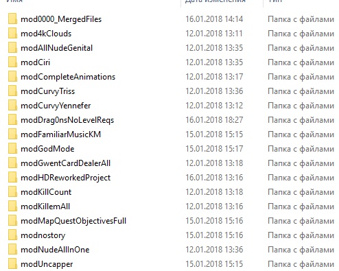 ды как таковых и нету модов то.мод облака 4к.мод гениталии.все голые.голые трис.йен.цири.шани.музыка из первых ведьмаков.быстрое перемещение на лошади.быстрое перемещение из любого места.кары гвинта у торговцев.но тот у барона в замке.убей их.статистика убитых монстров.геральд на стероидах.отключение интро.godmod.все объекты на карте.complete_animations.