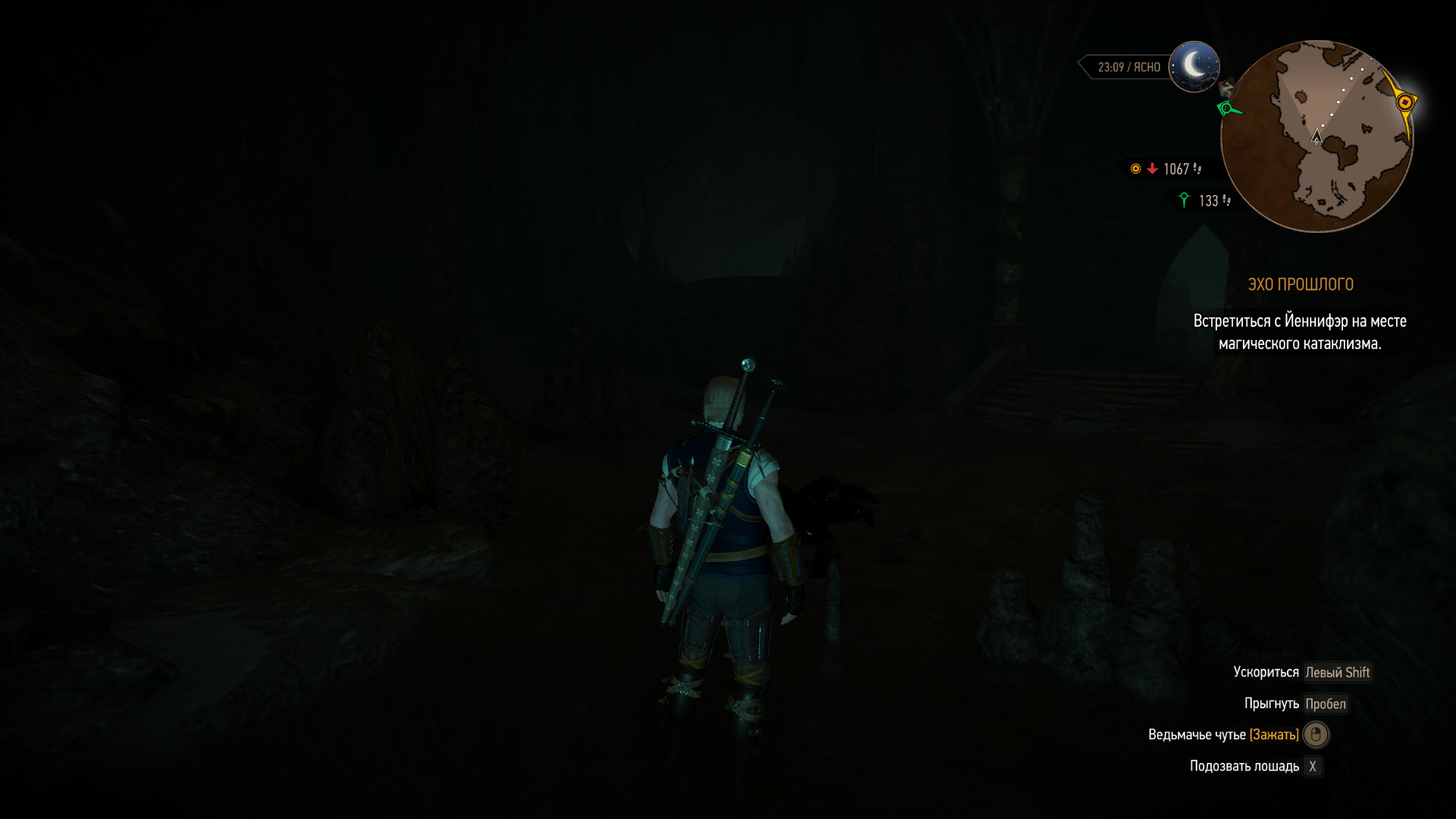 Слева можно запрыгнуть. Геральт цепляется за сталагмит, а потом перепрыгивает дальше.