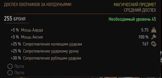 прохожу на 2 раз игру ломанул на 70 уровень . вся реликтовая броня после 50х уровней, в разы мощьнее чем комплект мастера медведя. сам бегаю с броней ласточки 67 уровня, она дает 336 брони плюс много чего бонусом. штаны махаканские 67 уровень 143 брони. сапоги народа орлых 67 уровень 145 брони. перчатки нильфгаардской армии 68 уровень 140 брони. стальной меч дневная звезда 69 уровень 524-640 урон. серебро меч ДЕЙТВЕЙН 68 УРОВЕНЬ 700-850 урон. ну короче из того что встречалось пока это самое злое все комплекты брони собрал ))) взлом игры был только на опыт.