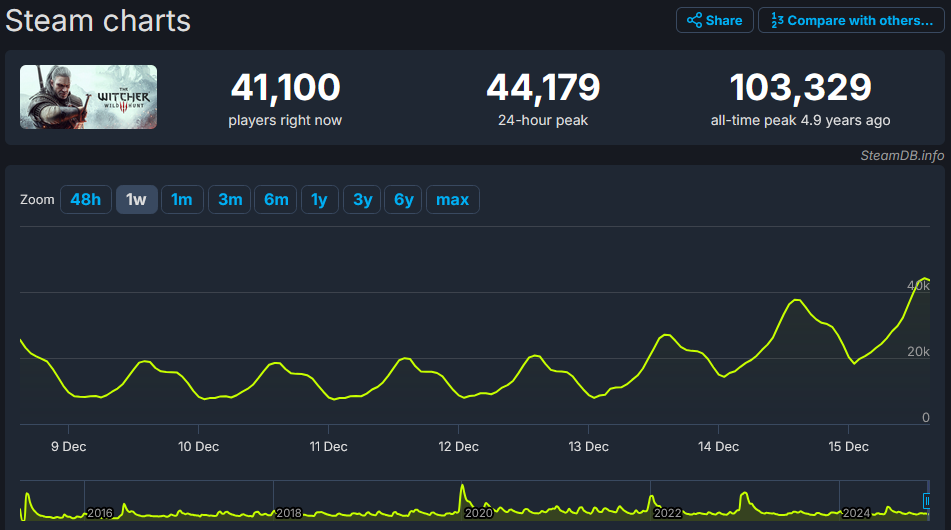 Несмотря на то, что в мае 2025 года The Witcher 3: Wild Hunt исполнится 10 лет, популярности хитовой игры CD Projekt Red могут позавидовать даже многие современные игры. Отмеченная наградами игра привлекла более 44 тысячи игроков в Steam за последние 24 часа. Если проанализировать статистику, то можно констатировать, что это самый высокий показатель за многие месяцы.