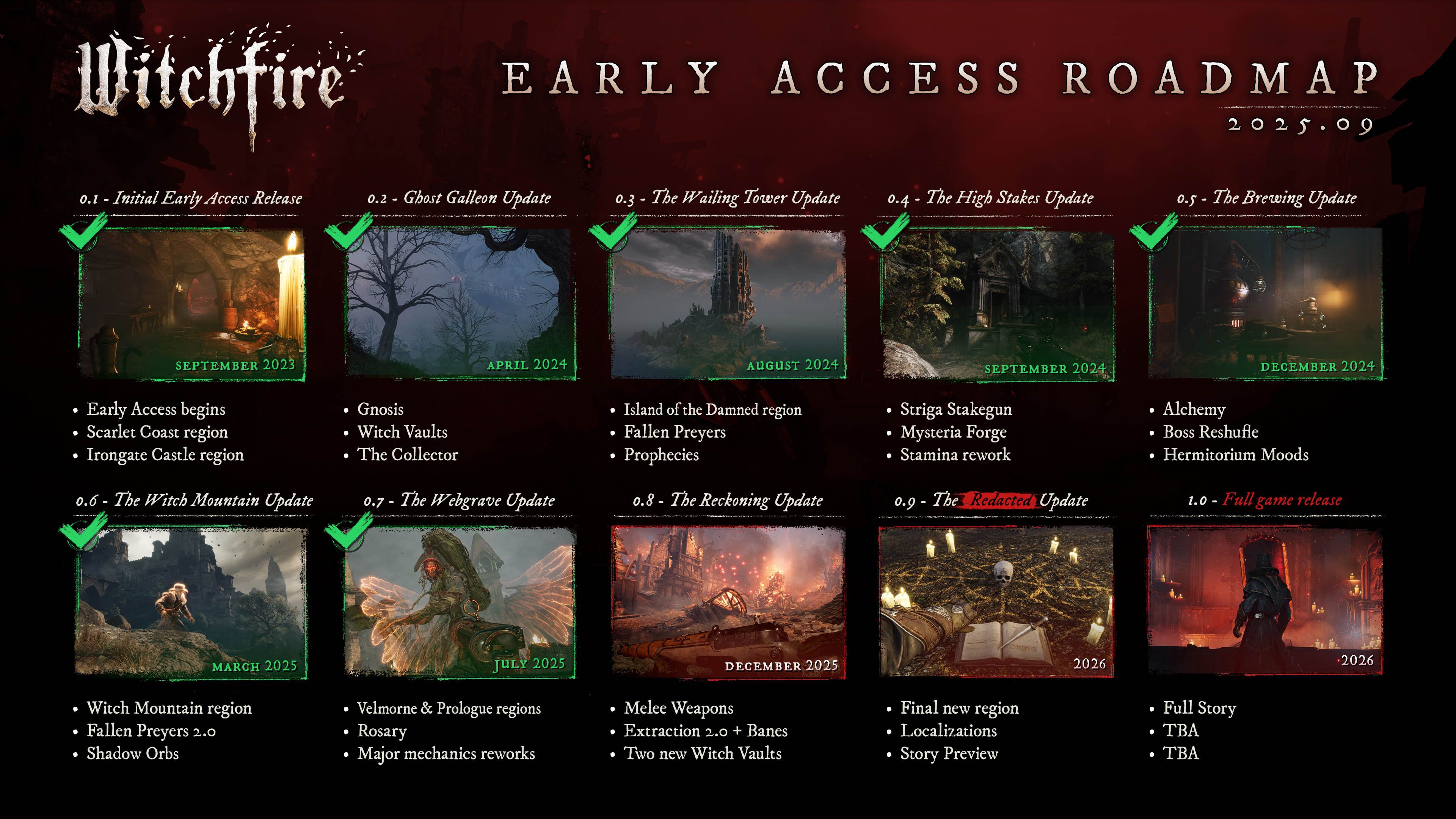Польская студия The Astronauts поделилась новым планом развития шутера Witchfire. Помимо запланированных обновлений для игры, разработчики также отметили уже завершённые этапы разработки — график ниже показывает, что ранний доступ стремительно приближается к завершению.