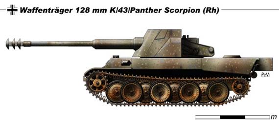 На каком-то западном кластере произошел слив месяца два назад. И было там следующее: самоходка с зенитным 128 мм орудием (то же самое, что на вафле), шасси пантеры модификации F. Двигатель 900 л.с. Барабан отсутствует.