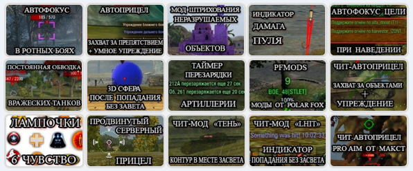 PIague Doctor пфф мой друг гоняет ладдер уже 4 месяца с тундрой (убирает растительность), с лазерными прицелами у врагов, контур танка остается после пропажи из засвета, с эхом на карте при разрушении объектов, попадания по невидимой цели показываются, перезарядка врага показывается и фиговой тучей еще чего. Дал ему этот пак друг который гоняет с такими читами уже года два и пак такой в принципе стоит у всех статистов. Для примера в ладдере все либо стараются не ломать в начале боя, либо кто нибудь едет и ломает у себя все на дороге изображая массовую атаку только потому, что чит на эхо стоит уже у всех.